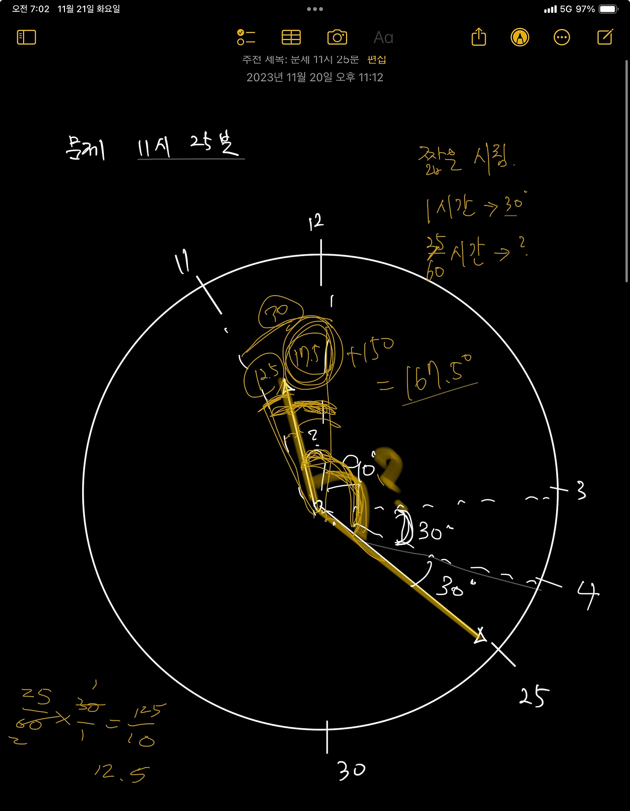 '어라.. 위의 문제를 맞혔는데 왜 11시 45분의 각도는 왜 못 구할까?'