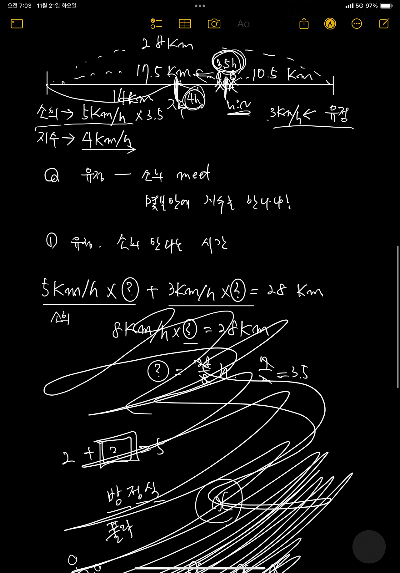 2번. '거리 28km가 차이나는 지역의 왼쪽 끝에서 소희는 시속 5km, 오른쪽에서 유정은 시속 3km로 서로를 향해 달려오고 있다. 그리고 소희와 동시에 시속 4km 속도로 지수도 유정을 향해 가고 있다면, 유정은 소희를 만난 후 몇 분 후에 지수를 만나는가?'