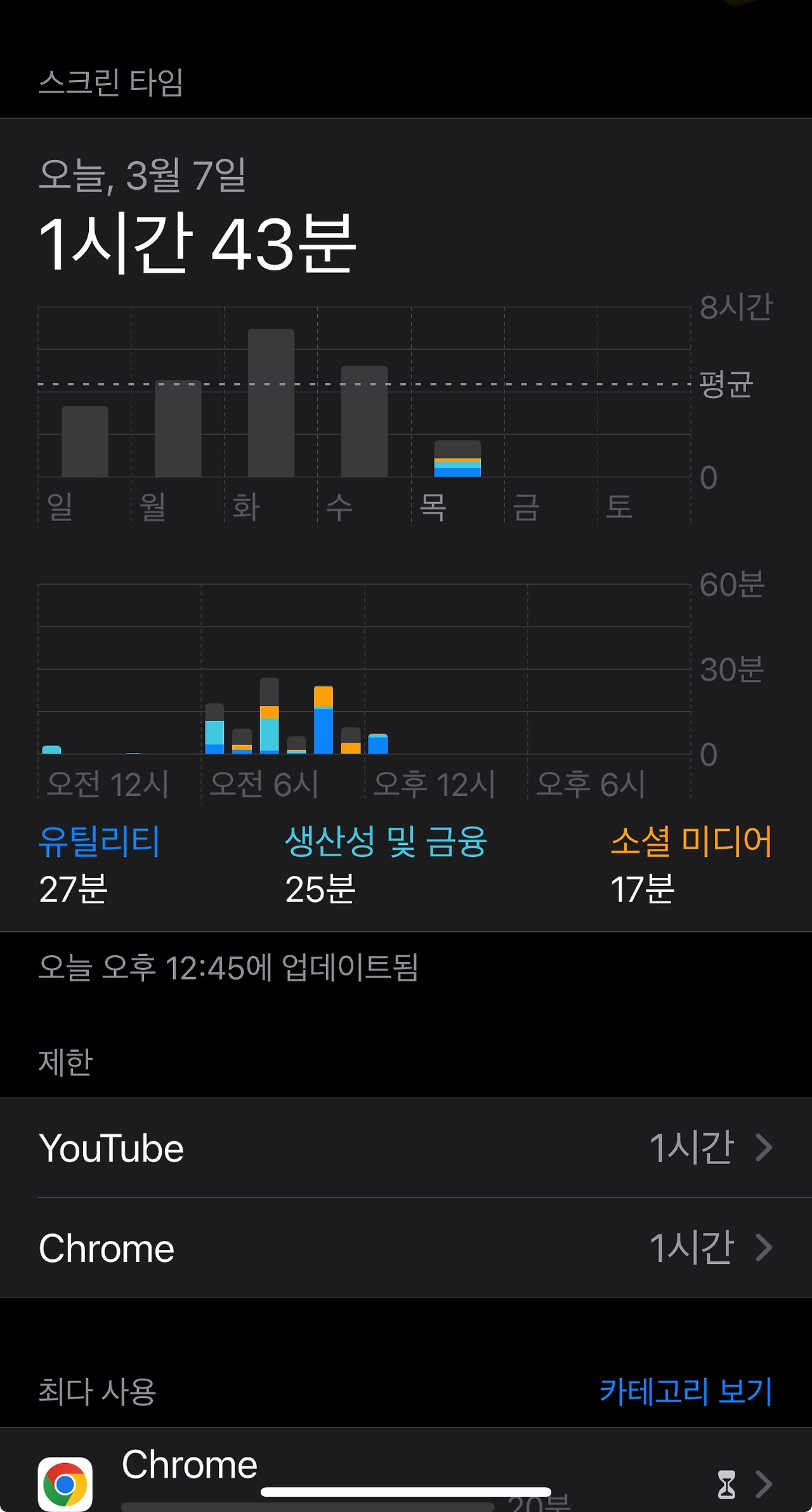 스크린타임을 열어 유튜브와 인터넷(크롬)을 각각 1시간씩 제한을 걸었습니다.