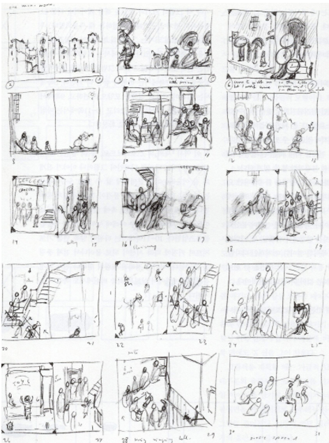 스토리보드를 제작 시 그림책에서 강조해서 보여줄 부분은 명암을 어둡게 넣거나 선을 진하게 사용하여 주제가 눈에 들어올 수 있게 한다. 정면에서 바라본 구도만 사용하면 그림책이 정적으로 느껴질 수 있기 때문에 그림책에서 움직임이 보일 수 있도록 카메라를 요리조리 움직이며 시점을 달리하여 다양한 각도로 그림을 구상해 본다. 또한 카메라를 멀리 빼서 전체적인 배경을 보여주기도 하고 등장 캐릭터를 강조하여 가깝게 초점을 맞추며 그림책에서 리듬감과 생동감이 느껴져야 한다. 『월요일 아침에』스토리보드를 살펴보면 사람은 러프하게 동그란 얼굴과 긴 몸통으로만 간략하게 그려 어떤 위치에 있고 어디에 있는지 대략적으로 알 수 있으며 특히 앞페이지에서 우산을 쓰고 빗길을 걸어가는 모습을 볼 수 있다. 배경도 마찬가지로 건물 외형이나 계단 등을 형태만 알아볼 수 있게 그려 어떤 배경에서 이야기가 펼쳐지며 이야기의 흐름이 어떻게 흘러가는지 한눈에 알 수 있다.