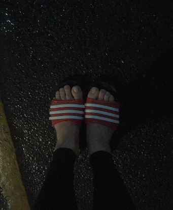 곧 달리기를 멈추고 자리에 서 비에 젖은 발을 사진에 담았다.