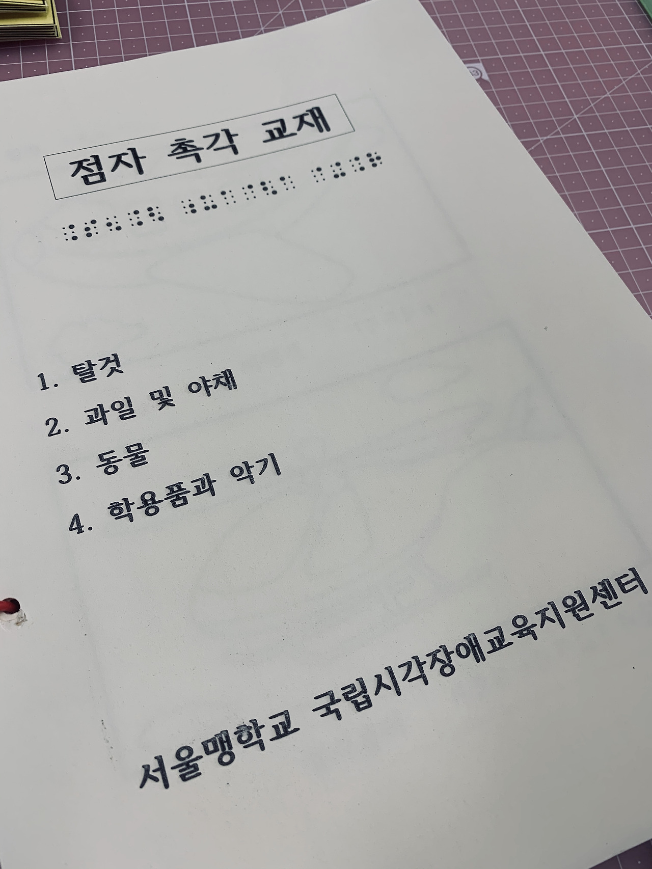 국립맹학교에서 주로 했던 활동은 '촉각교재'와 '점자책'을 만드는 것이었다. 아이들은 세상과 마주할 수 있는 다양한 감각을 손으로 익혀 나가는데, 기업 후원으로 만들어지는 교재로는 한계가 있어 자체 제작하는 교재도 꽤 많았다.