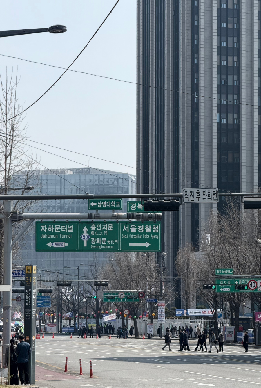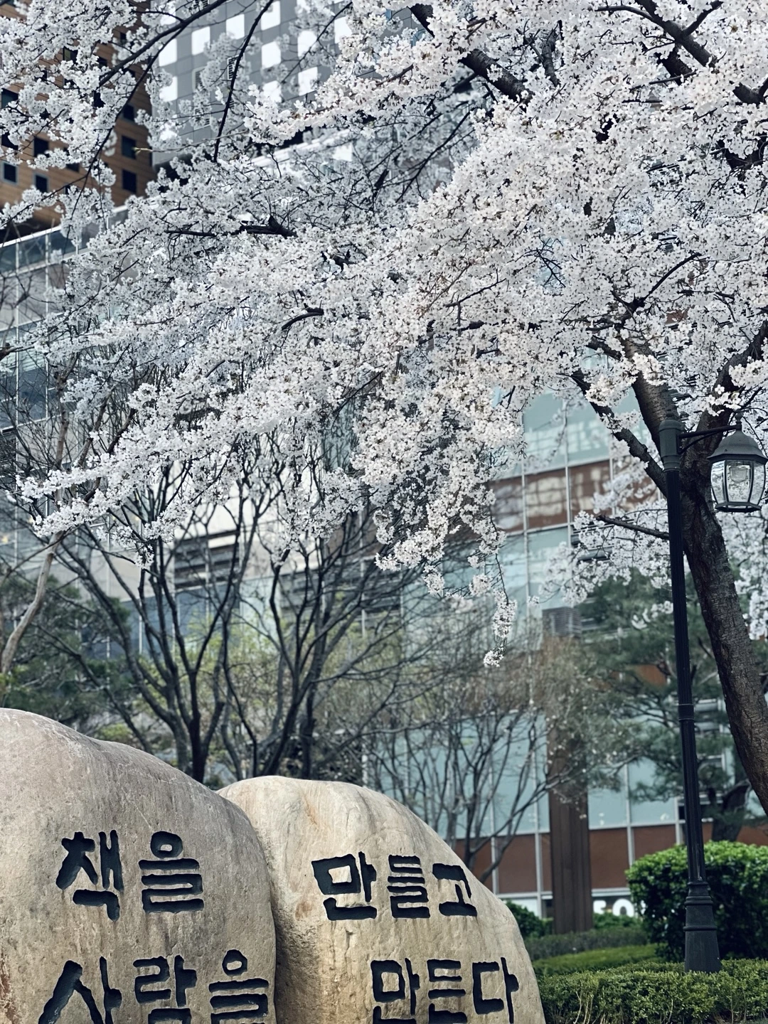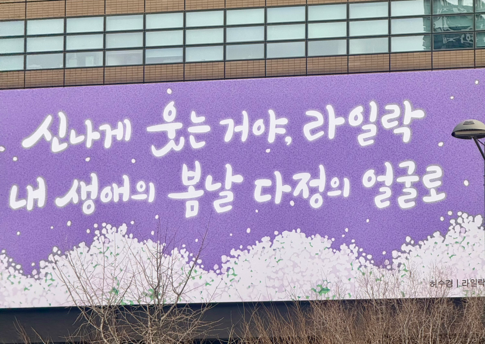 광화문 계절의 바로미터는 교보문고 광화문 글판이다. 올해 봄은 보랏빛 봄내음이 물씬 풍기는 허수경 시인의 <라일락> 구절이 걸렸다. 여러모로 떠들썩했던 광화문이지만, 이곳에도 결국, 봄이 찾아왔다.