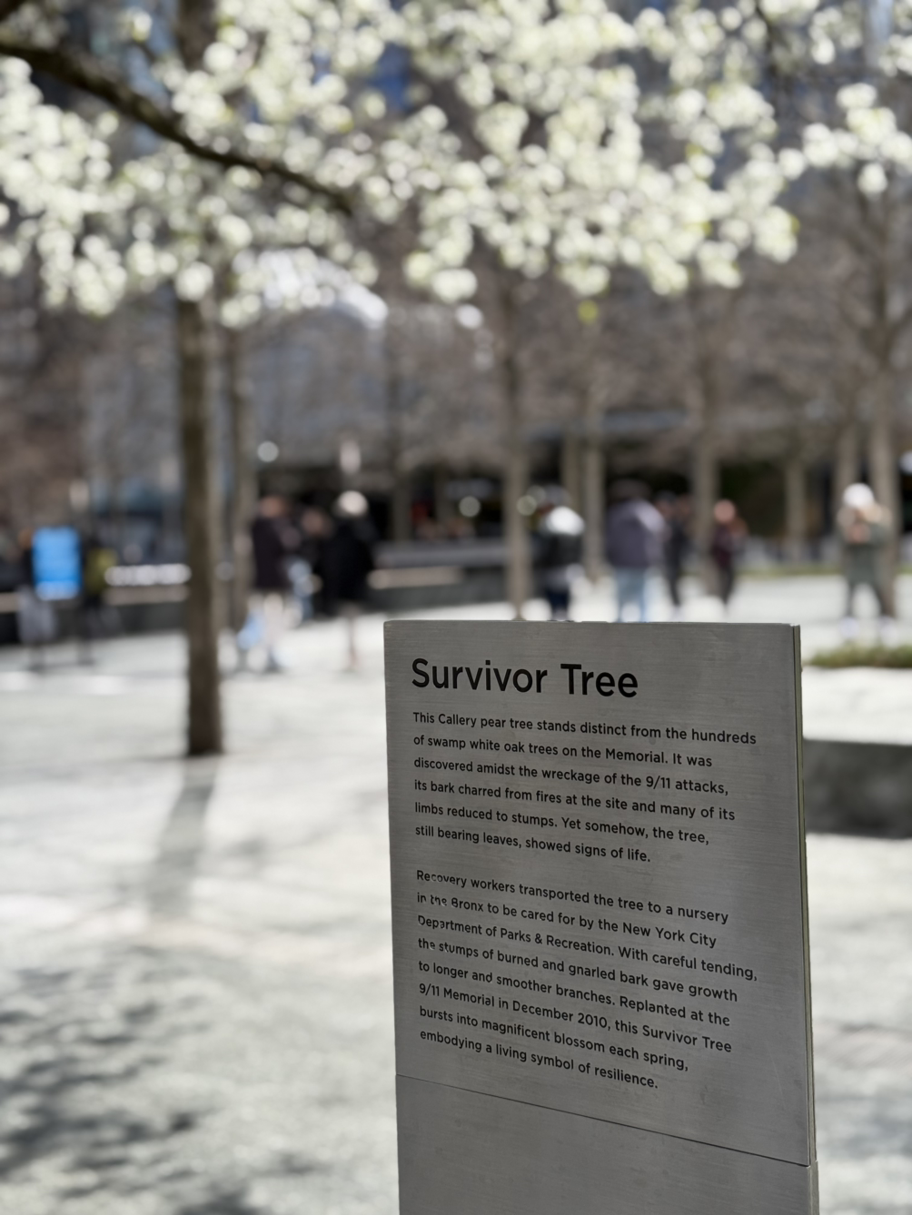 그리고 그 옆에 Survival Tree가 있었다. 911 테러에서 유일하게 살아남은 나무라고 했다. 당시 나무껍질이 검게 그을려 있었지만 그 후 섬세한 복원작업을 통해 다시 가지가 살아나고 2010년 이곳으로 옮긴 이후 매년 봄마다 꽃망울을 피워내며 회복의 상징으로 재탄생되었다고 한다.