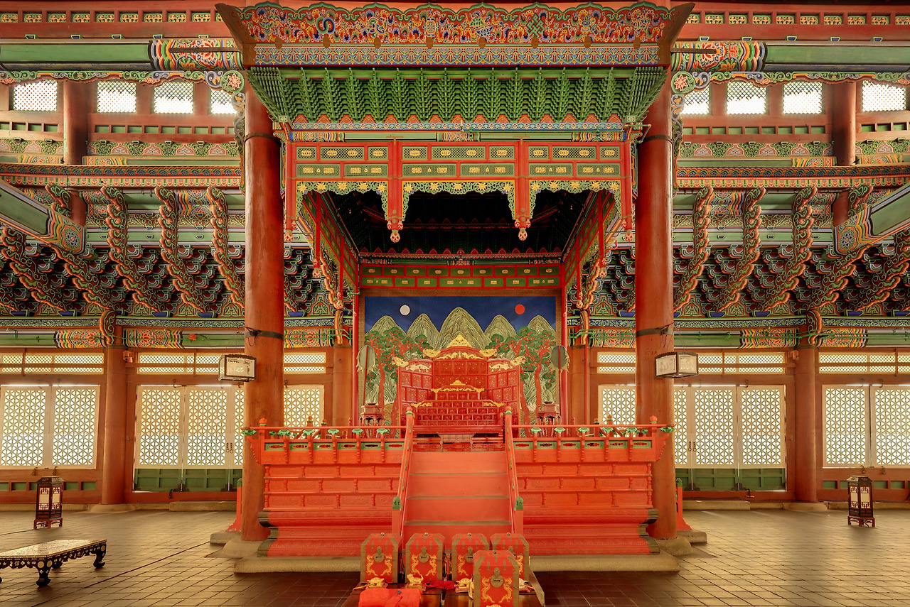근정전은 밖에서 보면 2층 건물처럼 보이지만, 안을 들여다보면 속은 사실상 하나의 높은 천고로 되어 있다.