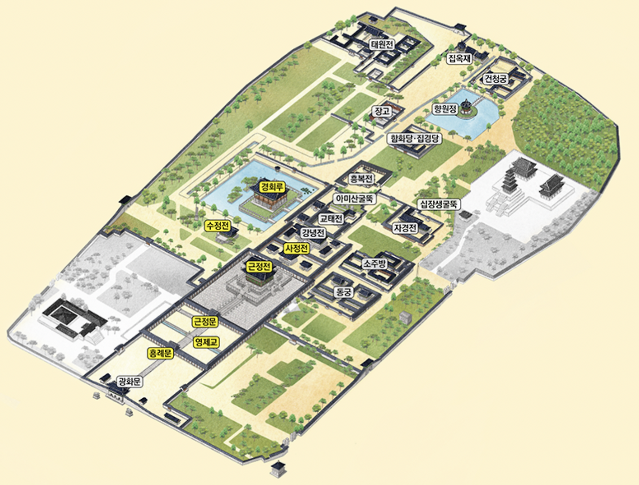 아름다운 경치로 유명한 경회루는 외국 사신을 접대하거나 종친과 공신들에게 연회를 베풀던 곳이다. 원래는 아무나 볼 수 없게 벽으로 막혀있었으나, 지금은 출입구가 있는 쪽을 제외하고는 경회루 전경을 한눈에 담을 수 있다. 경회루로 건너가는 문은 동쪽으로 총 세 개인데, 자세히 보면 세 개의 문 크기가 다 다르다. '이견문, 함홍문, 자시문'을 가진 세 개의 문 중 가장 큰 문은 왕이 다니는 문이고, 다른 두 문은 신하와 그 외 사람들이 다니는 문이었다고 한다.