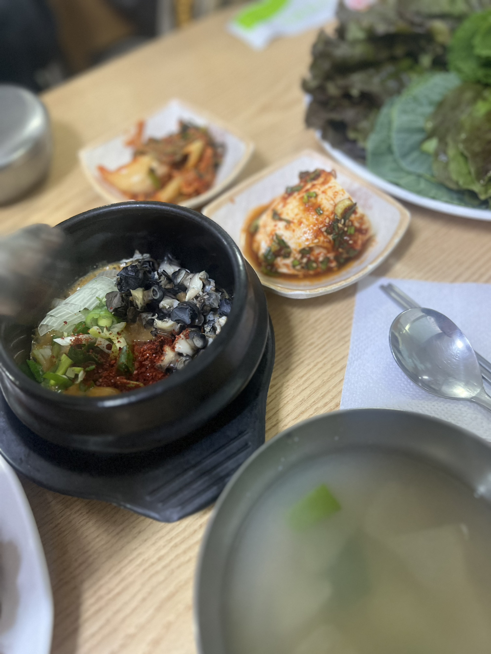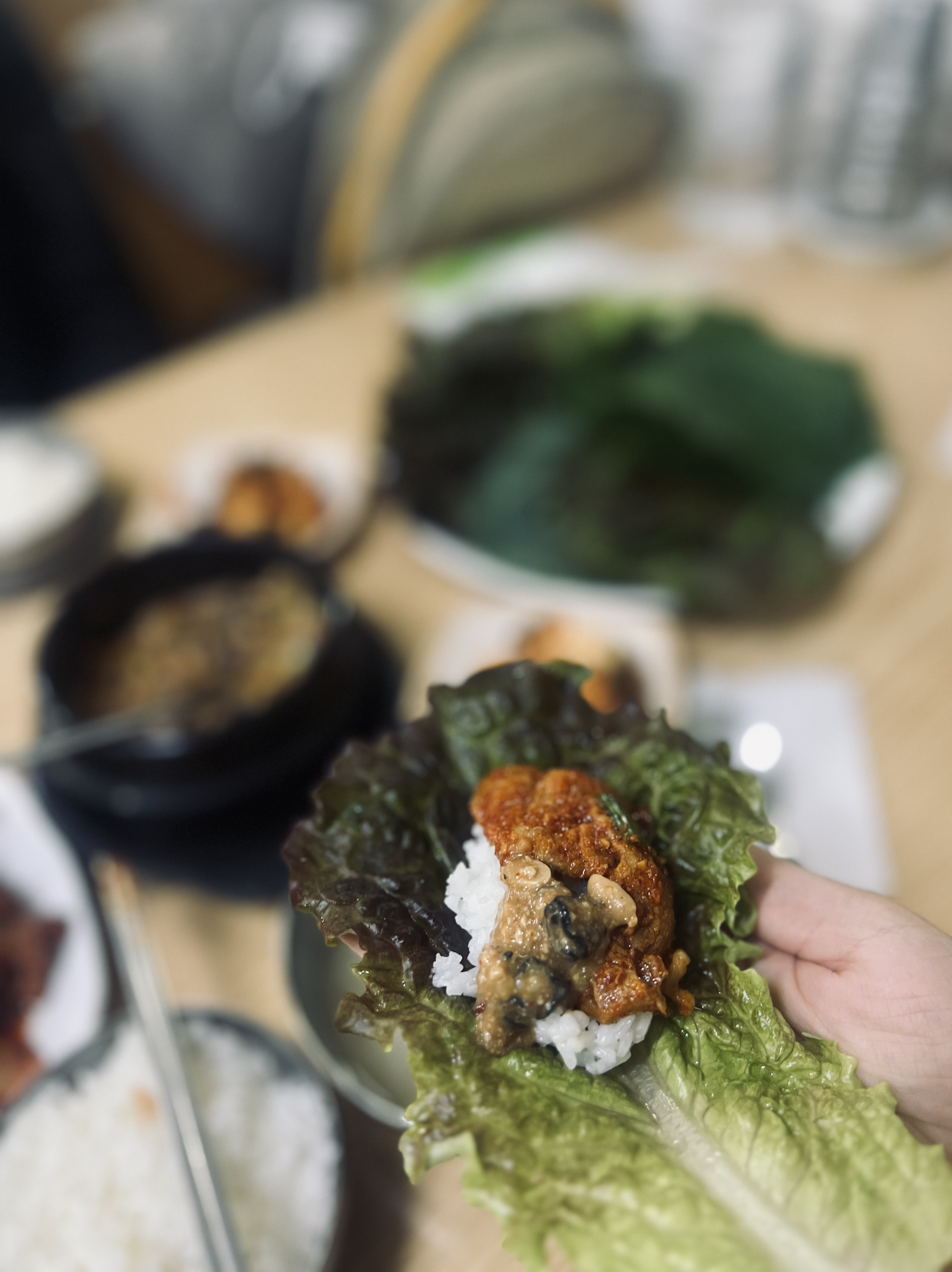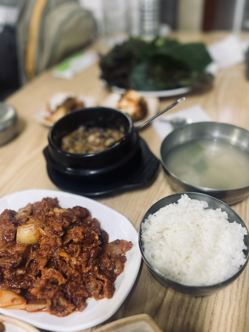 둘이 간다면 우렁쌈밥, 제육쌈밥을 하나씩 시키면 된다. 인근에서 가장 아낌없이 쌈이 나오는 곳이다. 뚝배기에 끓여 나온 우렁된장은 잘 비벼서, 상추 위에 밥 한 숟갈, 우렁된장 한 숟갈, 제육 하나 얹어 싸 먹다 보면 밥 한 공기가 뚝딱 사라진다.