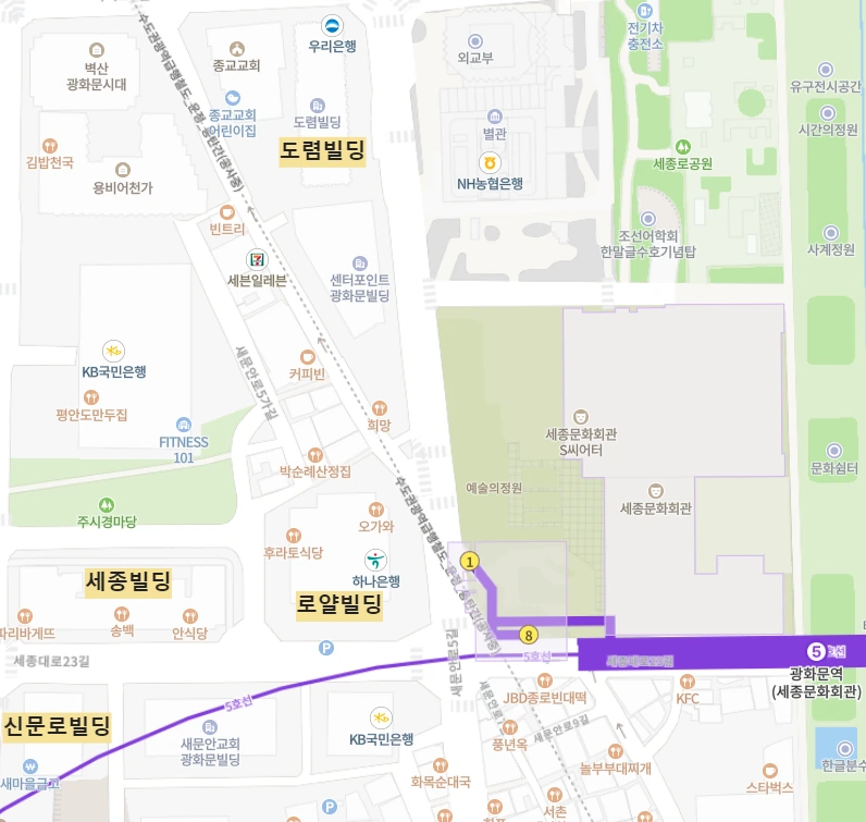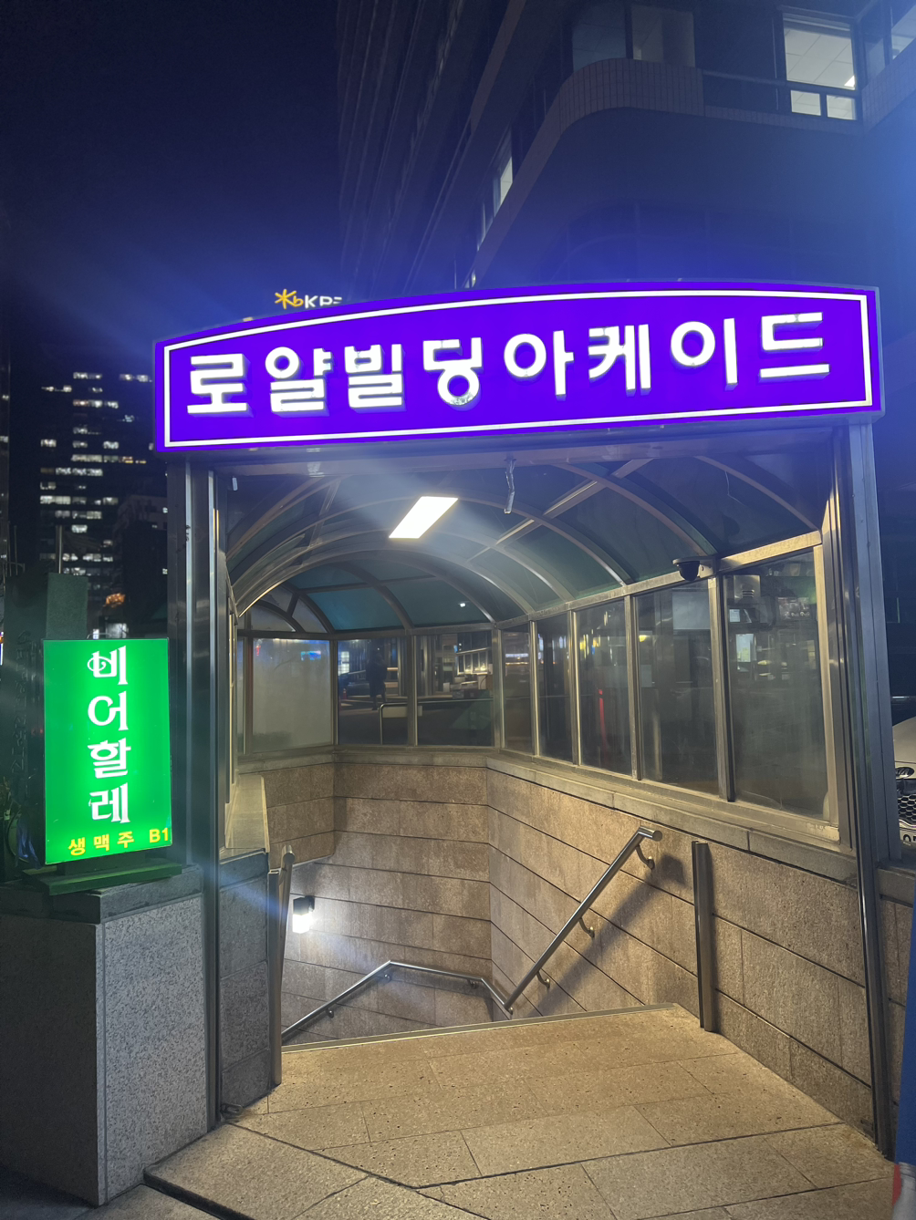로얄빌딩은 광화문역 1번 출구를 나오면 바로 보이는 건물이다. 외관은 흰색과 민트색 벽돌로 되어있고, 1층엔 KEB하나은행이 있다. 건물이 커서 지하 아케이드로 내려가는 입구만 3곳이다.