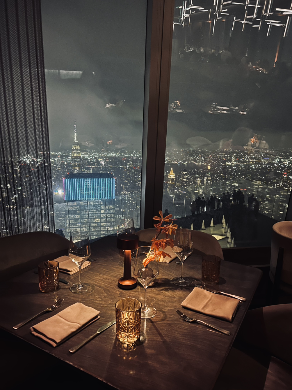 낮시간에 맞춰서 간다면, PEAK 레스토랑에서 햄버거 같은 단품을 먹을 수도 있고, 런치 코스도 있다. 올해 봄에 갔을 때는 날이 좋았지만 바람이 많이 불어서, 날아갈 것 같았다. 엄마의 아이디어로 스카프로 모자를 고정시키자 한결 나았다. 고모할머니, 엄마 모두 거센 바람과 맞서며 뉴욕 전망을 구경하고 실내로 들어와 30분 정도 의자에 앉아 휴식을 취했다. (쉴 수 있는 의자가 별로 없어 눈치 싸움이 필요하다.)