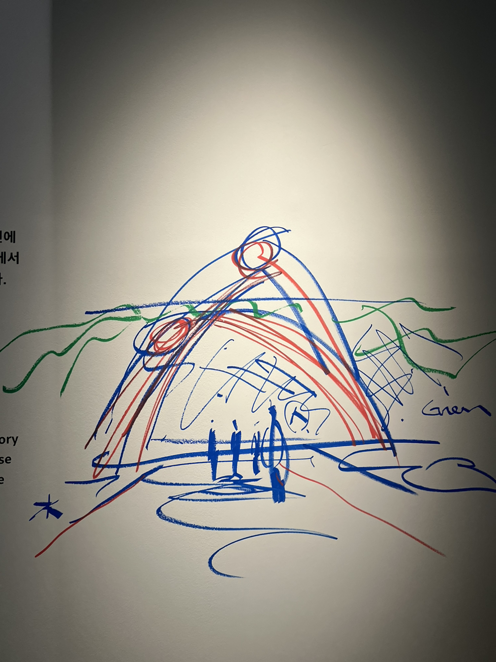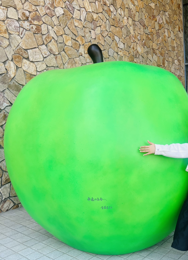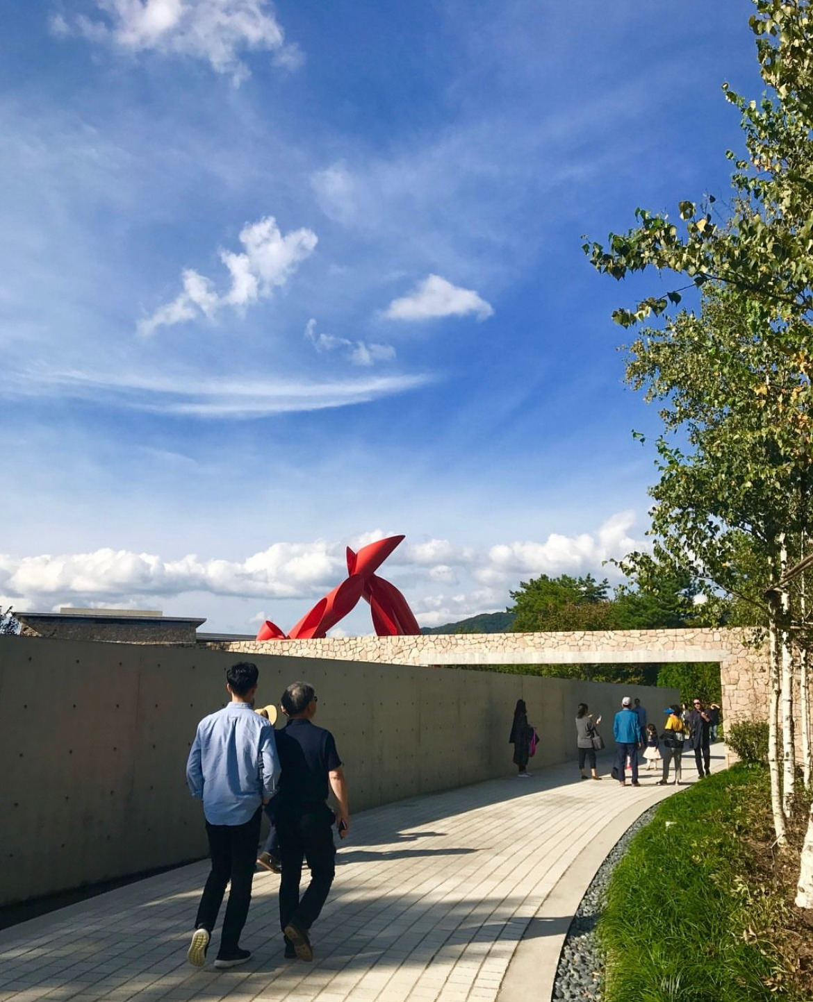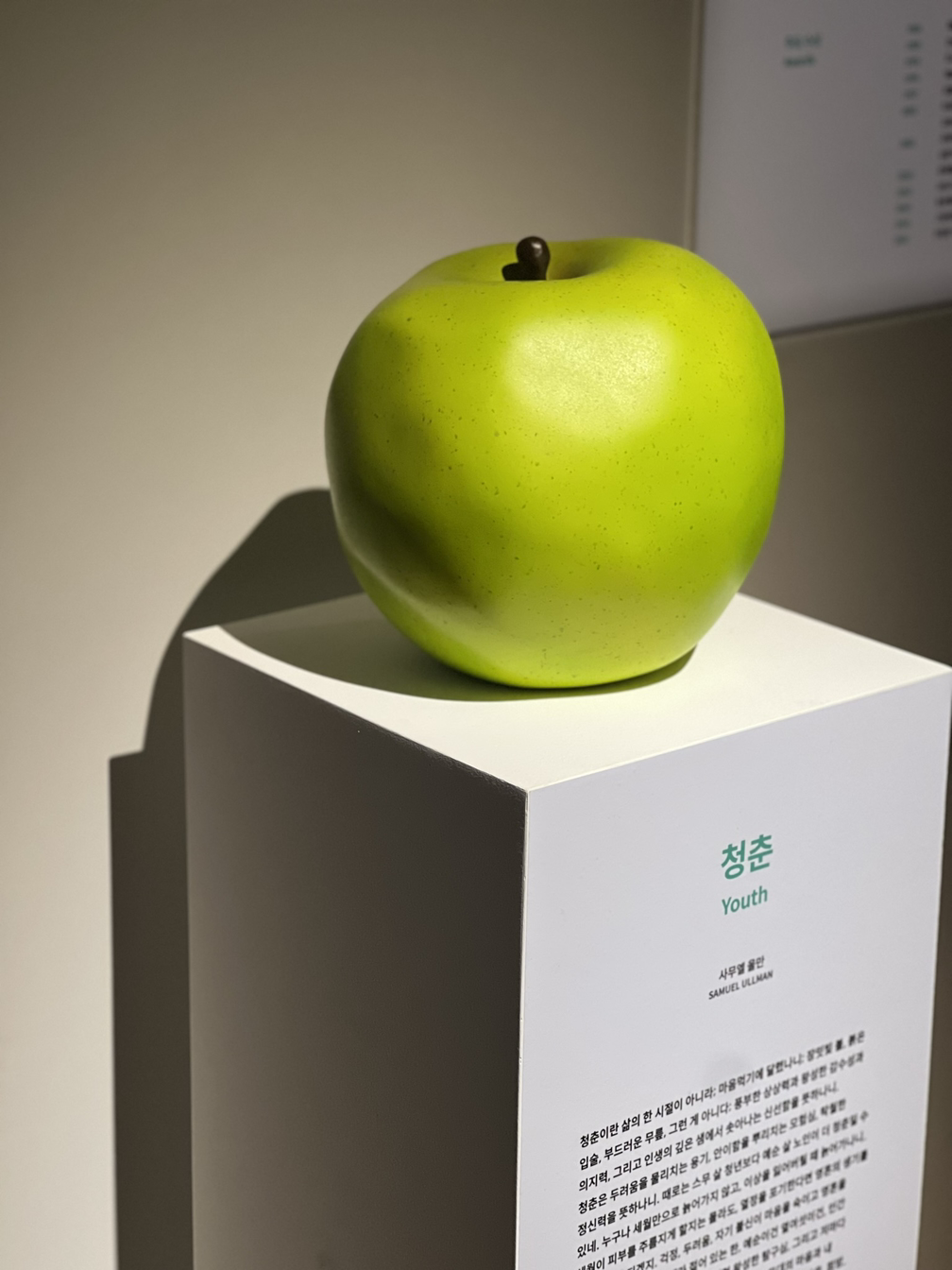 게이트를 지나면 미술관 입구에서 거대한 초록 사과를 볼 수 있다. 일본 효고현립미술관, 나카노시마 어린이책 숲 도서관에 이어 세 번째로 제작된 야외 조각 '청춘'으로, 사무엔 울만의 시에서 영감 받아 안도 타다오가 직접 제작했다. 강연에서 그는 이 초록 사과를 만지면 한 살씩 어려질 수 있다며, 초록사과 ‘청춘’ 안아보기를 추천했다. 그렇게 나도 청춘의 마음가짐으로 염원을 담아 초록 사과를 살포시 안았다.