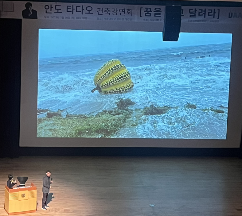 건축가 안도 타다오를 직접 볼 날이 올 줄은 몰랐다. 뮤지엄 산 전시를 위해 그가 한국에 왔고, 운 좋게 서울대학교에서 열렸던 강연을 들었다. 그는 건축 인생과 함께 청춘으로 사는 법을 이야기했고, 그 후 나는 뮤지엄 산에 가서 실제 존재하는 초록 사과를 꼬옥 안았다.