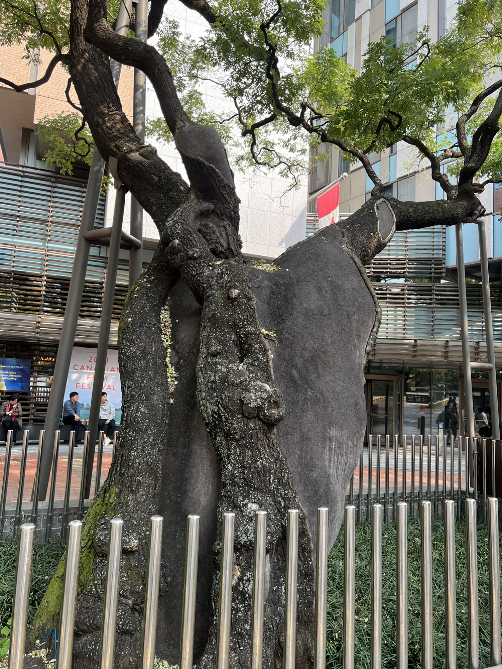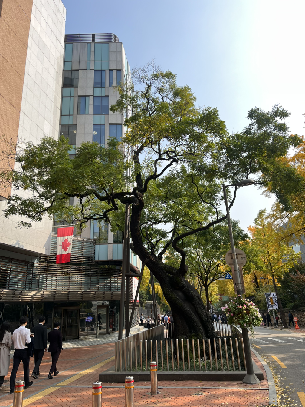 정동길을 걷다 보면 캐나다 대사관 앞에 있는 500살 넘은 회화나무를 만날 수 있다. 높이 17미터, 둘레 5m에 달하는 이 보호수는 2003년 캐나다 대사관이 건축 당시 나무를 위해 건물의 건축 디자인까지 변경했다고 한다. 나무의 뿌리가 다치는 것을 막기 위해 터를 굴착하는 일도 동면 주기에 맞추어 겨울에 진행했고, 나무의 둘레를 감안해 건물의 디자인을 완만한 곡선으로 하였다. 노목을 위해 지지대를 설치해주기도 했다.