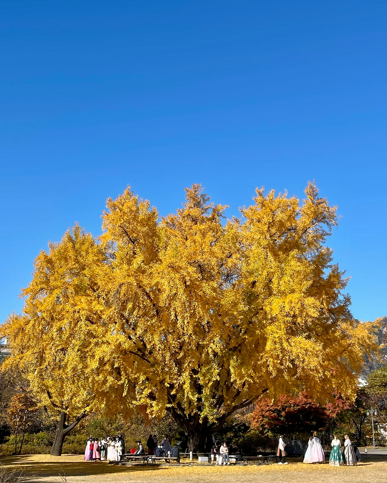 바로 고궁박물관 옆 은행나무다. 흐드러지게 흩날리는 은행잎들을 만날 수 있는 이곳은 현재, 천천히 황금빛으로 물들고 있는 중이다. 한복을 입은 관광객들이 어우러져 드라마틱한 풍경을 연출하기도 한다.