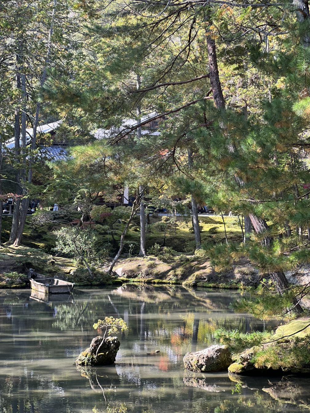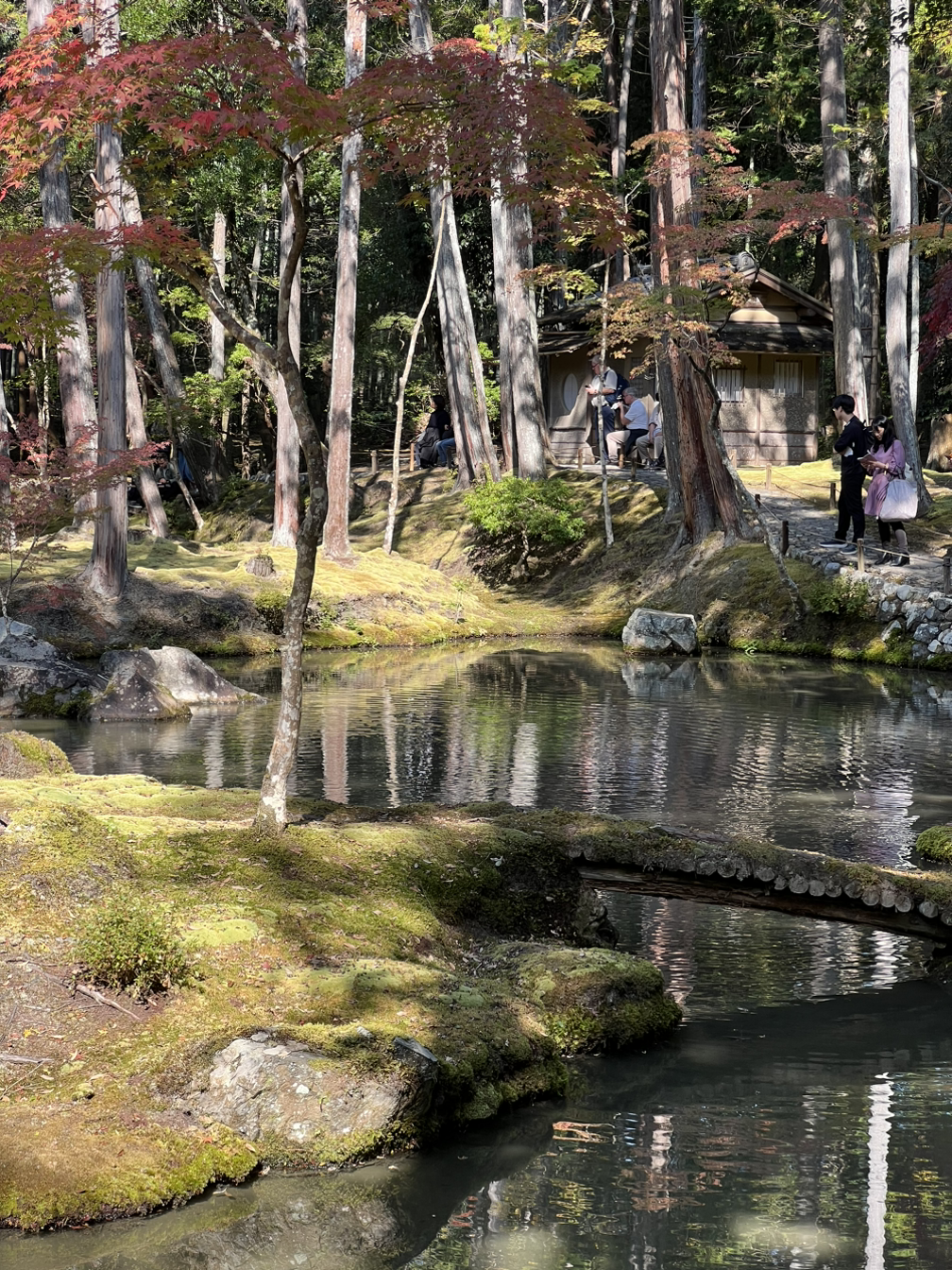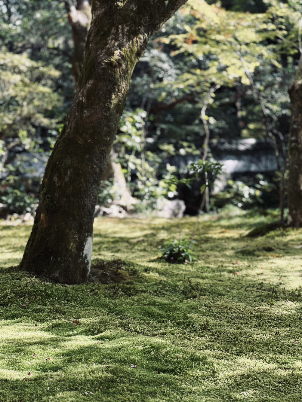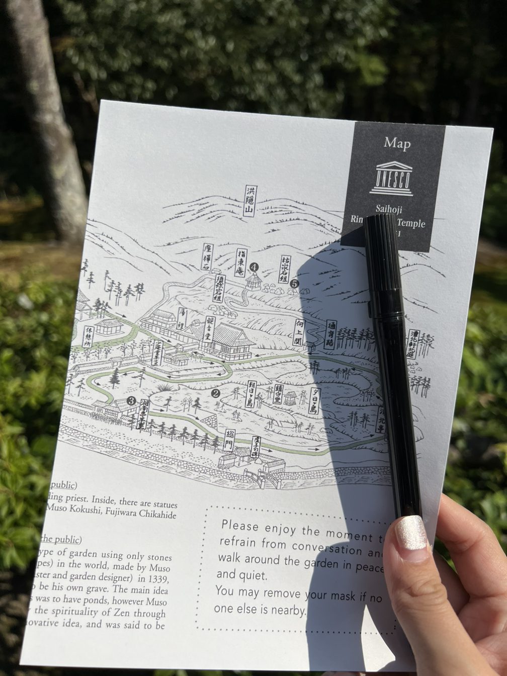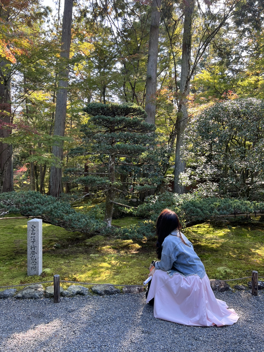 실제로 법당에 들어서자 경전 글귀가 써져 있는 종이와 붓펜을 나누어 주었다. 한 글자 한 글자 필사에 집중하며 마지막에는 내 이름 석자를 적었다. 그리고 정원에 들어서는데 온통 이끼로 덮인 흙과 돌, 나무들이 너무 신비로웠다. 솜털 같은 이끼를 직접 만져보기도 하고 눈으로 담아내면서 커다란 연못을 따라 천천히 걸었다. 사이호지는 대표적인 치센카이유식 정원(중앙에 있는 연못 주위를 돌며 관상하는 정원)으로, 물에 비치는 정원의 모습 또한 아름다웠다. 햇볕에 비치는 자연을 있는 그대로 느끼며 이곳에서도 한참을 머물렀다.