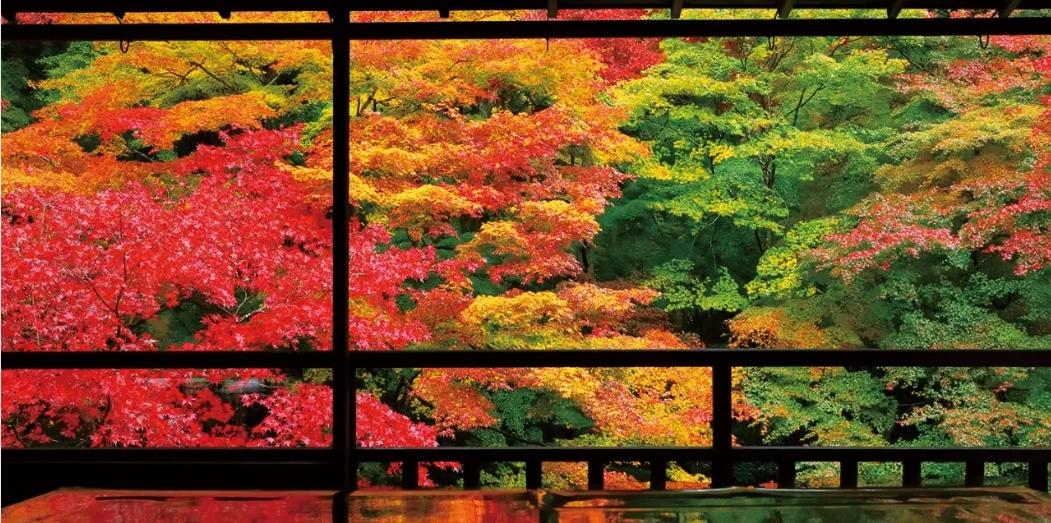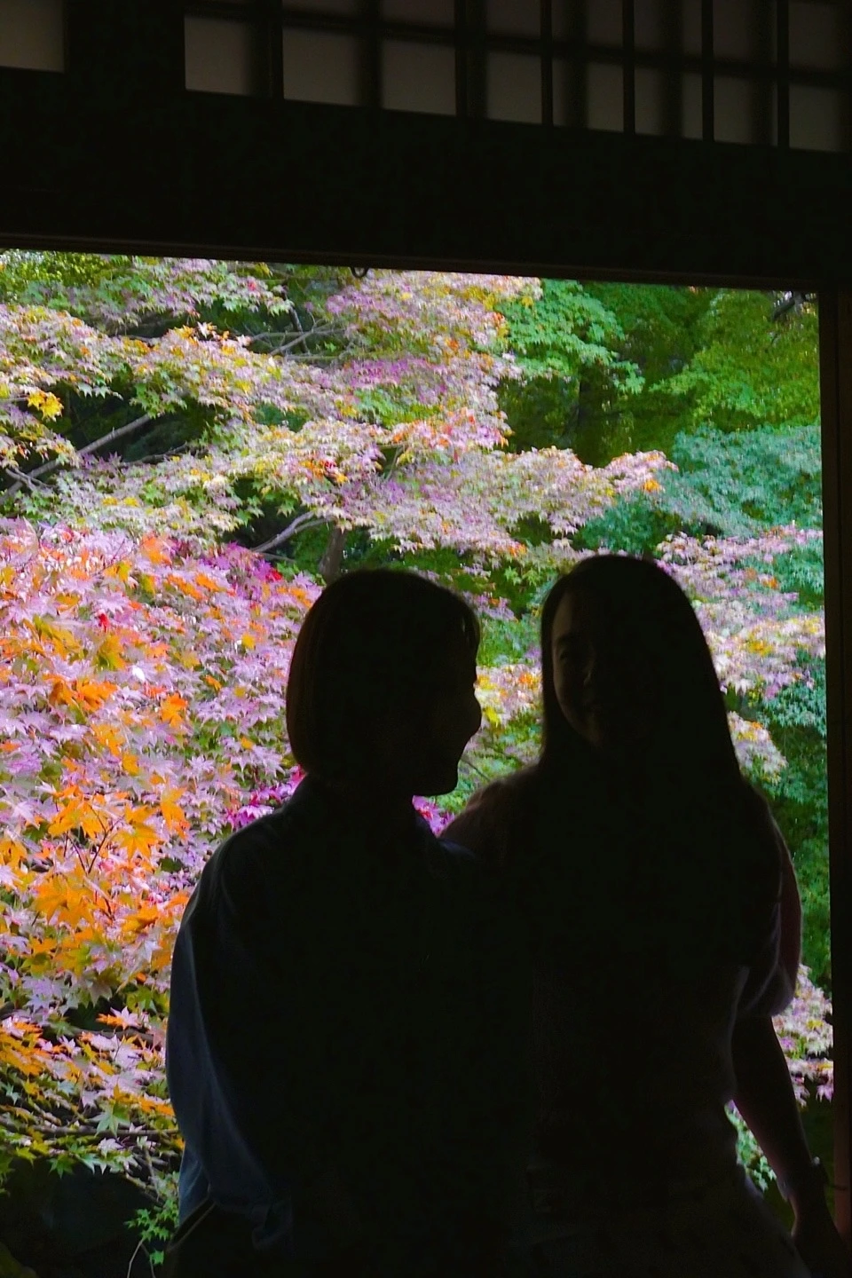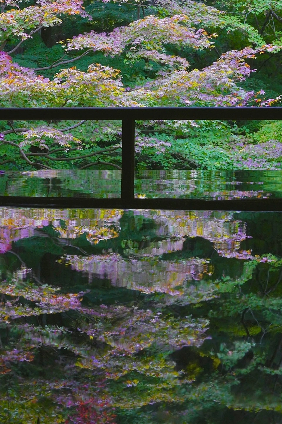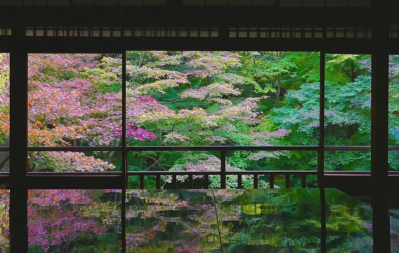 입장 시간에 맞추어 대기하다가 단풍 한줄기가 드리워진 정문을 통해 들어간 루리코인은 세 개의 정원으로 이루어져 있었다. 돌계단을 통해 사찰로 올라가는 길도 좋았지만, 신발을 벗고 실내로 들어가 2층에서 마주한 첫 번째 풍경이 정말 아름다웠다. 이곳은 풍경 Reflection으로도 유명한데, 자색빛(瑠璃色)으로 빛나는 모습에서 '루이코인(瑠璃光院)'이라는 절의 이름이 붙여진 만큼 오묘한 자연색이 공간을 가득 채웠다. 동양의 모네 <수련> 같다는 생각도 들었다.