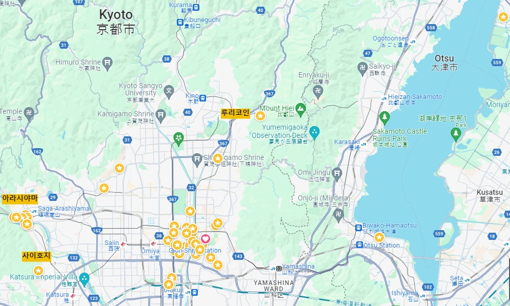 언니와 함께 두근거리는 마음으로 '야마자키 위스키 투어'를 신청했지만, Lottery 당첨이 되지 않았기에 새로 일정을 짜야했다. 금각사, 은각사, 청수사 등 관광지로 유명한 곳들은 가본 경험이 있기에, 블로그나 유튜브 대신 구글맵을 찬찬히 훑었다. 교토 근교의 산과 호수가 눈에 들어왔다. 그렇게 이번 여행은 교토 근교에 있는 장소들을 가게 되었고, 공항을 제외하고는 한국 여행객들을 거의 찾아볼 수 없었다.