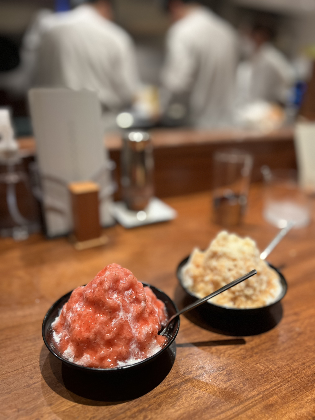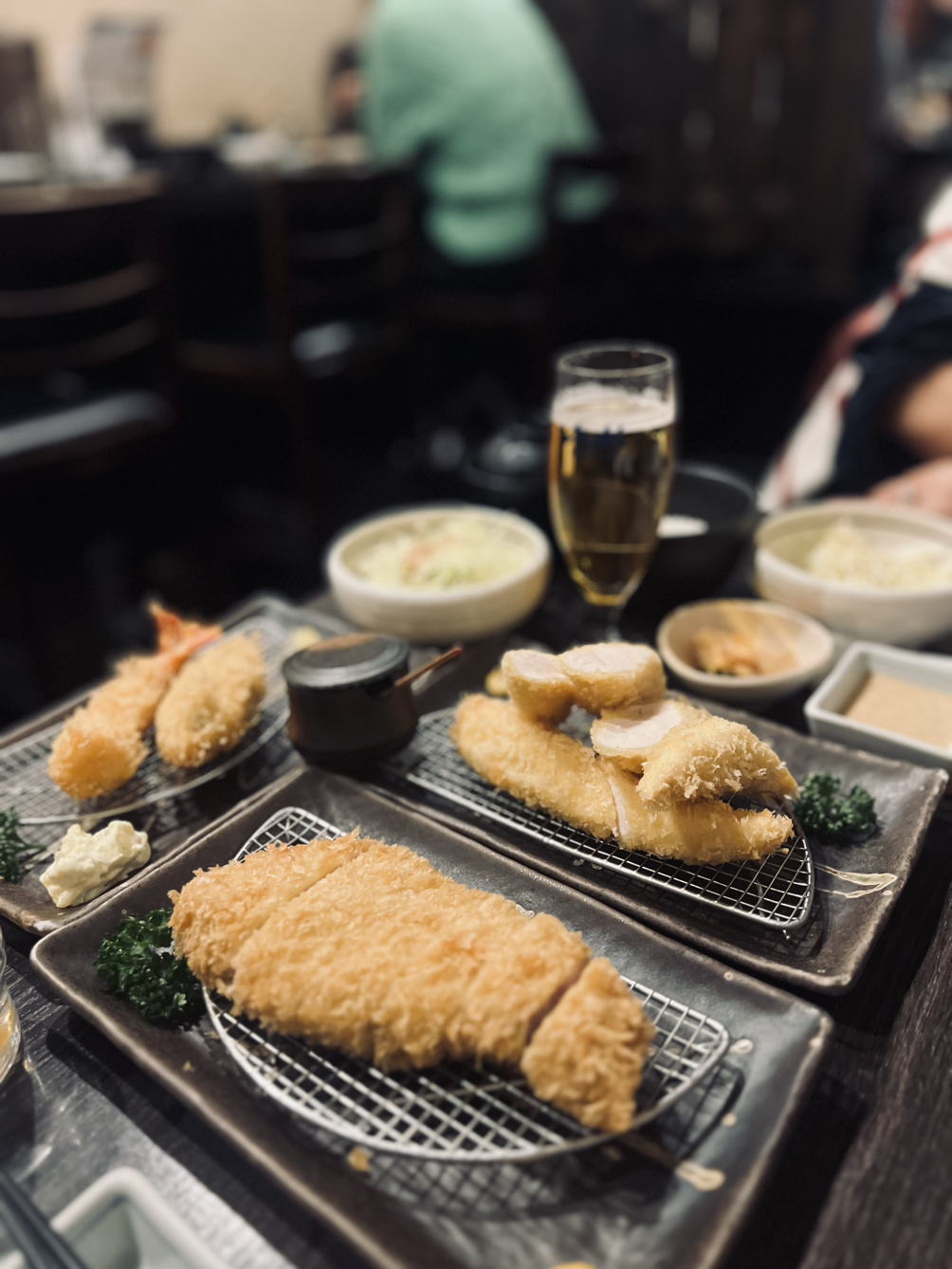안심으로 만든 히레카츠가 나왔는데 육즙부터 마시고, 그다음 소금과 소스를 찍어 먹어보라고 했다. 등심으로 만든 로스카츠, 윗등심 부위인 상카츠, 미니 버거 모양의 멘치카츠도 연달아 나왔다. 나는 여러 부위 중에서도 와사비를 잔뜩 얹은 로인카츠를 맛있게 먹었는데, 와사비가 느끼함을 잡아주면서 돈가스 본연의 고소함을 느낄 수 있는 맛이었다. 맥주 곁들임도 좋았는데, 마지막 디저트로 나온 거대한 빙수까지 야무지게 먹었더니 배가 터질 것 같은 저녁이 되었다. (그러고 나서 가방이 사라진 걸 알았던 것이다.. 사방팔방 다닌 덕분에 소화가 다 되었다.)