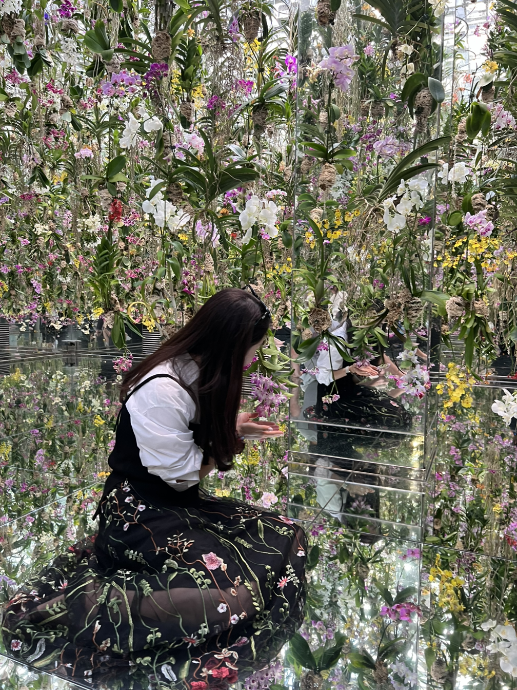 'Crystal Universe'는 전체 공간이 크리스탈로 빛나는 곳으로, 빛과 조명, 거울을 통해 무한히 확장된 공간을 느낄 수 있다. 사진 찍기도 좋아서 많은 시간을 보낸 곳이기도 하다. 'Floating Flower Garden'은 말 그대로 꽃들이 공중에서 떠다니는 공간이다. 공중에 있던 난초과 꽃들은 흙이 없는 곳에서도 살 수 있는데 공기 중의 수분을 흡수하여 자라난다고 했다. 짧은 시간임에도 충분히 난초과 꽃들의 향을 느낄 수 있었다.