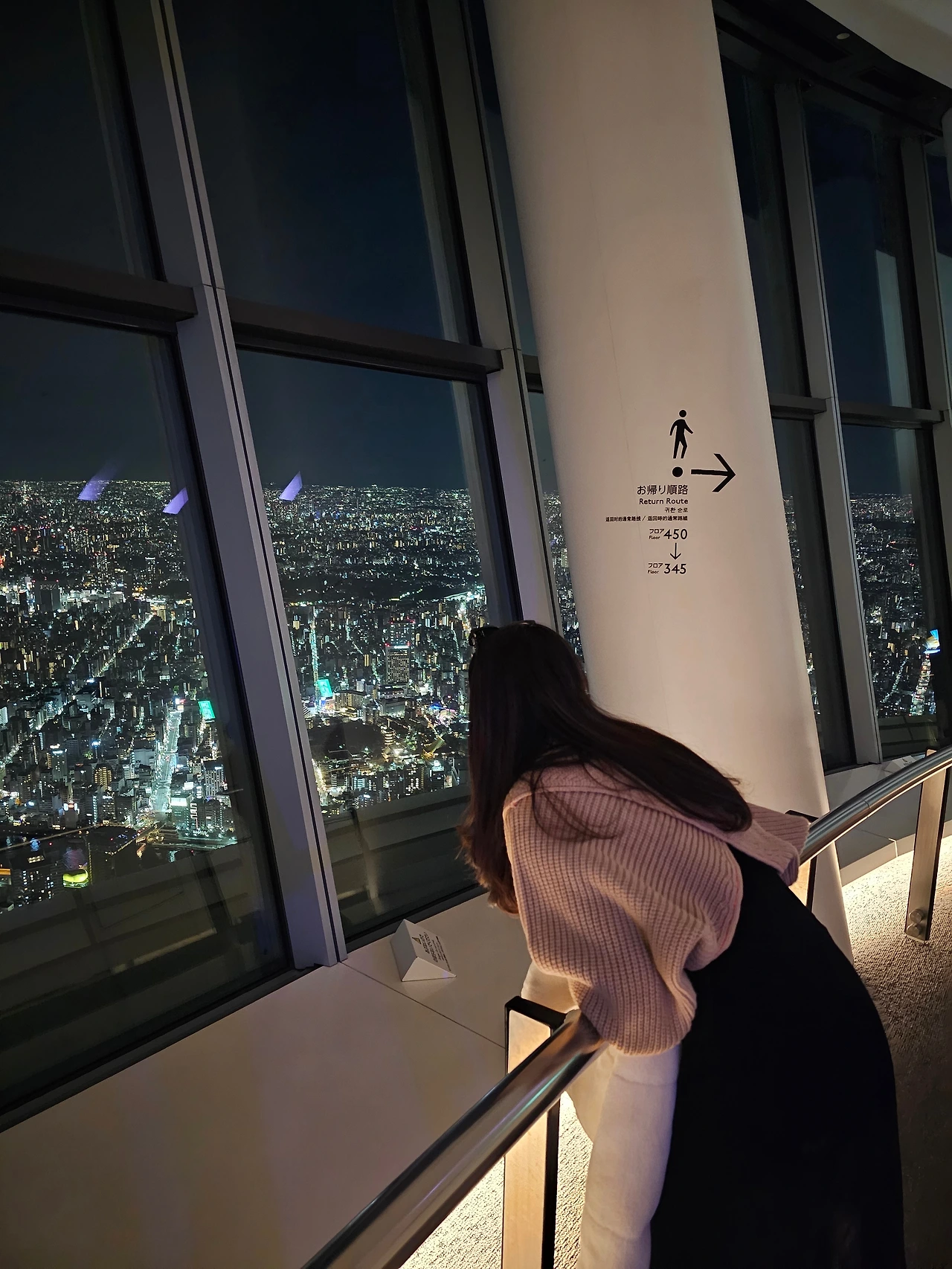 350m 전망대와 450m 전망대에 따라서 입장료가 달라지는데, 450m 전망대에는 유리로 되어 있는 발판도 체험할 수 있다. 두 공간 모두 360도 통창으로 되어 있어 원형 공간을 돌며 도쿄 전역을 살펴볼 수 있다.