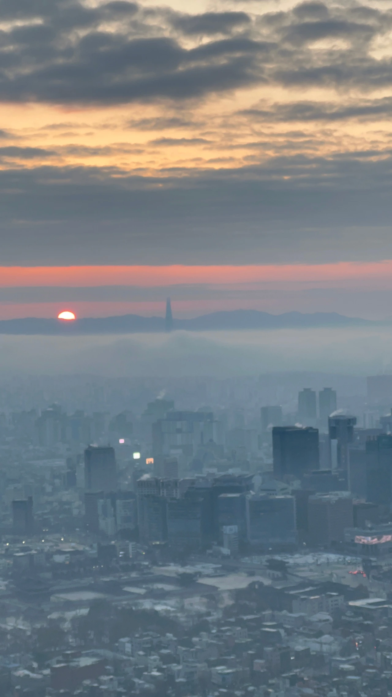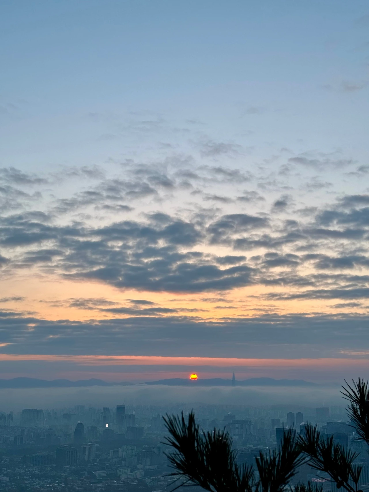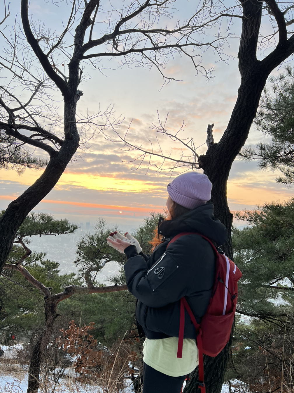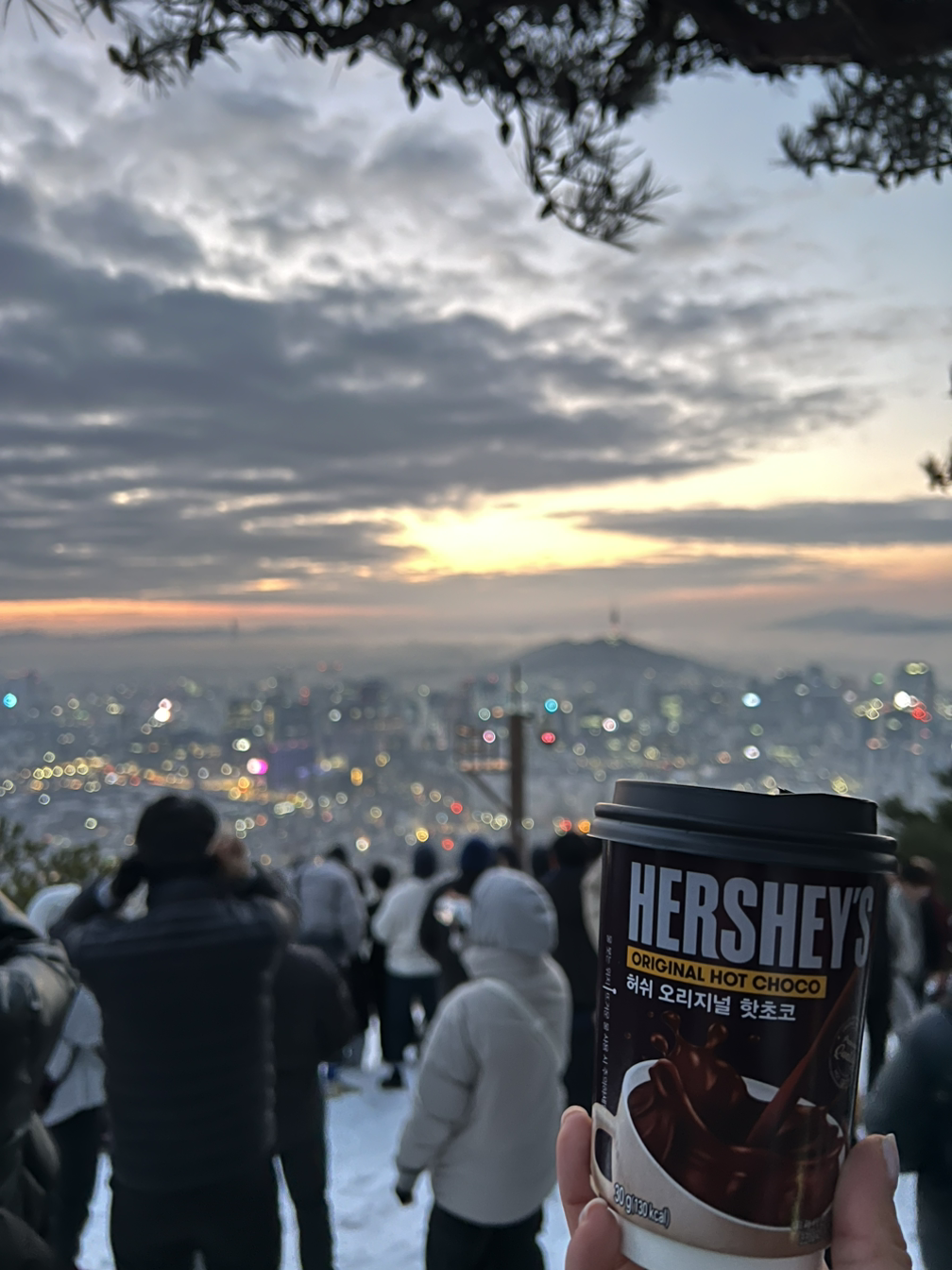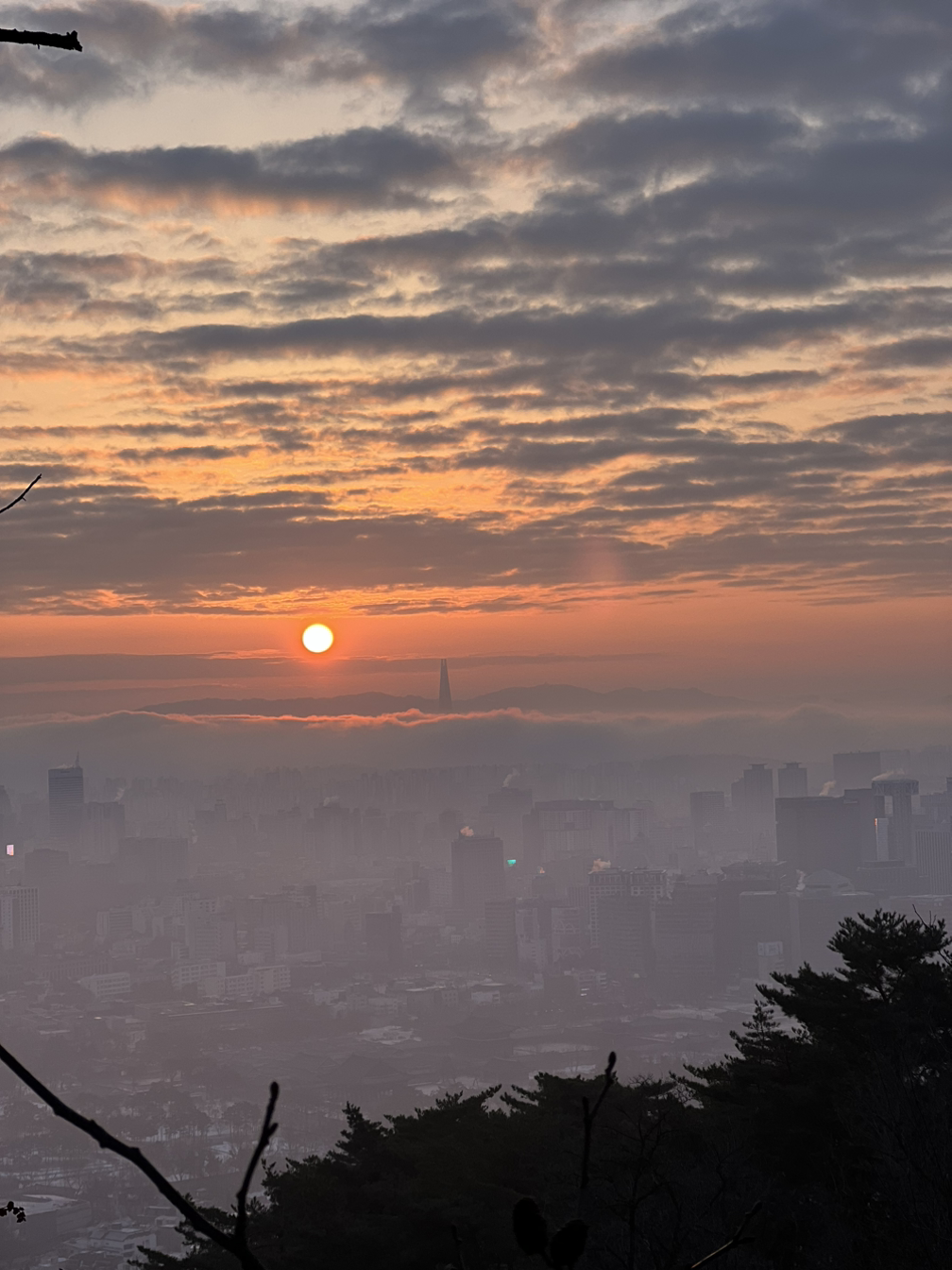 녹지 않은 눈으로 등산길이 꽤나 미끄러웠으나, 아이젠을 껴서 오르기가 한결 수월했다. 산을 잘 타는 친구가 선두에 선 덕분에 우리는 빠르게 정상에 올랐고 범바위 쪽에 자리를 잡을 수 있었다. 인왕산 정상은 금세 새해 첫 일출을 보러 온 사람들로 가득 찼다. 서울 전경이 한눈에 담기는 풍경을 바라보는데, 어둑했던 하늘이 점점 밝아졌다. 정상에서 서있으려니 바람이 꽤나 차가웠다. 친구가 가져온 핫초코를 홀짝홀짝 마시며 몸을 녹이고, 챙겨 온 곤약젤리도 나누었다.
