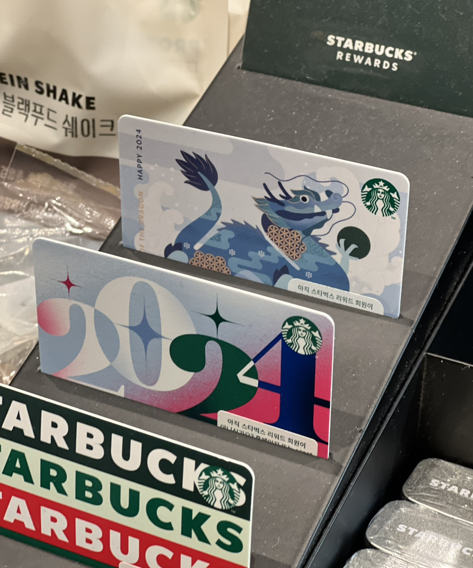 스타벅스에서는 새해가 되면 12 지신을 모티브로 하는 MD가 출시된다. 재작년은 호랑이, 작년에는 토끼해로 해당 띠인 가족과 가까운 사람들에게 선물했다.(귀엽고 의미도 있어서 다들 좋아했다.) 오후가 되어 가까운 스타벅스에 갔더니 금빛으로 빛나는 용 머그컵이 있었다. 청룡이 그려진 스벅카드는 충전하여 부모님께 새해 기념으로 드렸다.