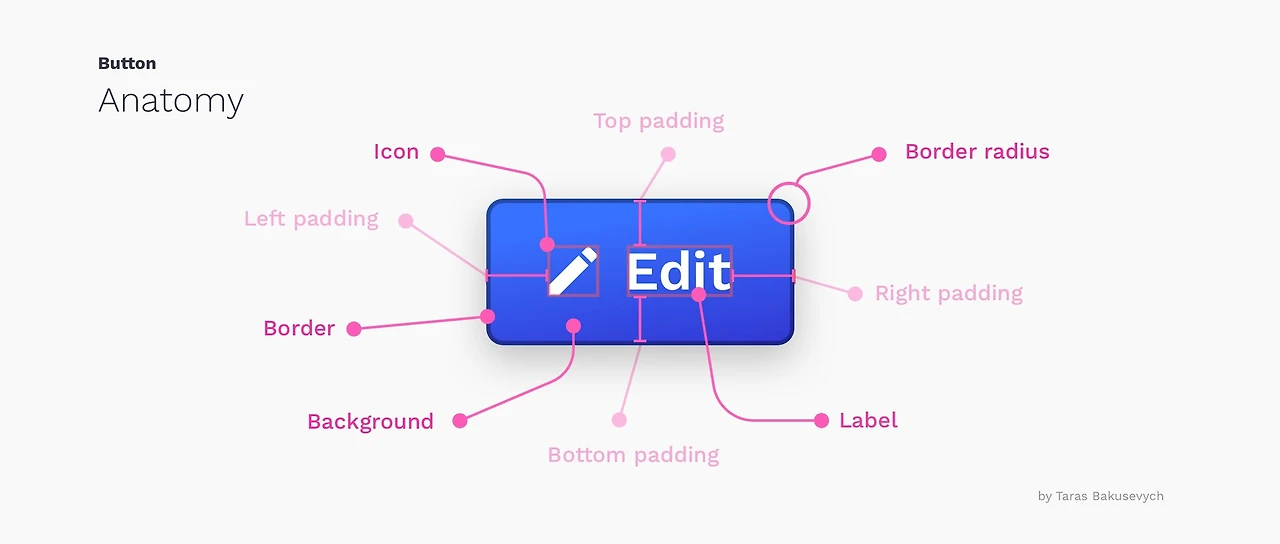 예를 들어 위의 예제에서 Edit 버튼이 있다. Edit 버튼의 구성요소를 살펴보면 Edit라는 Button Label 이 있고, 연필 모양의 아이콘 그리고 outline, shadow로 이뤄져 있다.