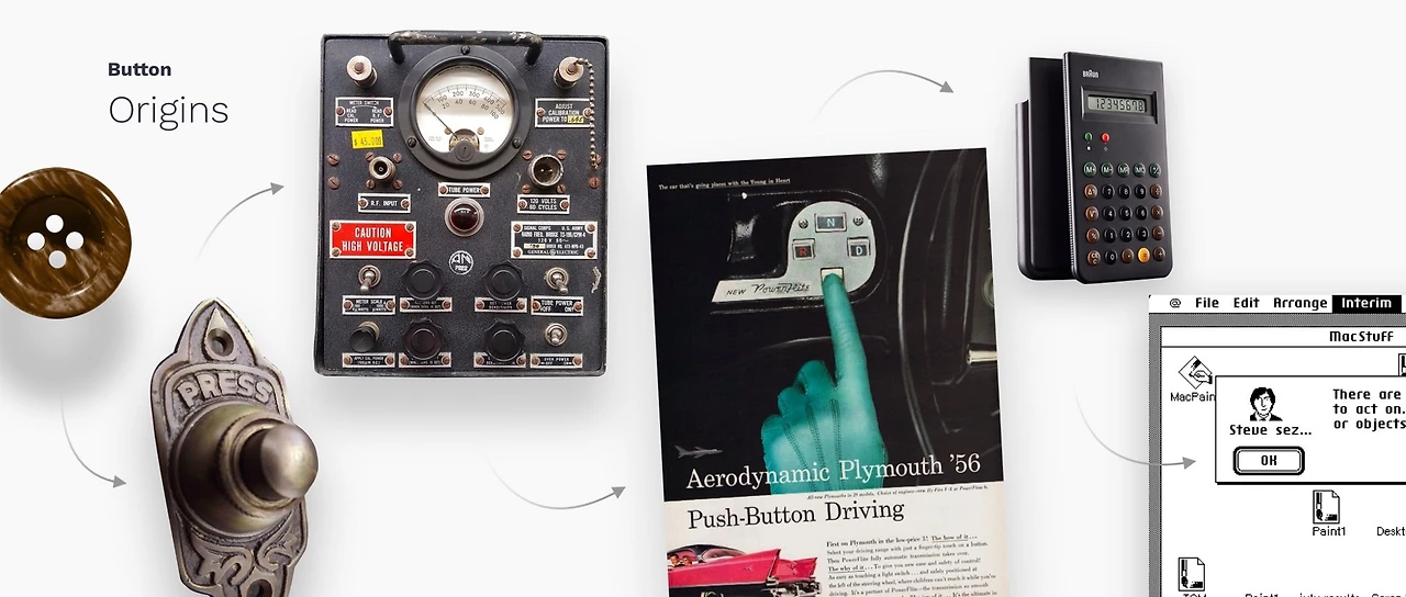 올바른 인터렉션 디자인을 위해서 우리는 오늘날 모든 디지털 제품에 매우 많이 사용되는 UI component(컴포넌트) 요소의 직접적인 전임자인 물리적 push buttons(누르는 버튼)에 대한 기원과 변화의 과정을 살펴볼 필요가 있다.