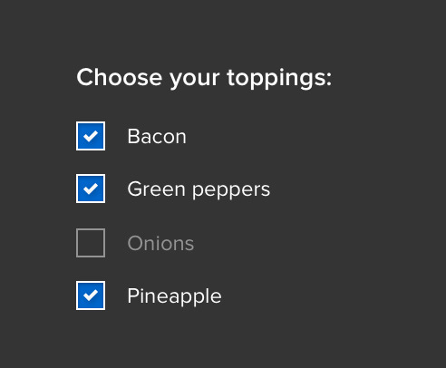 사용자가 항목 목록에서 옵션을 선택하지 않거나 하나 또는 여러 개 선택할 수 있는 경우 체크박스를 사용해야 한다. 버튼은 정사각형이어야 하며 선택 시 체크 표시 또는 X가 있어야 한다.