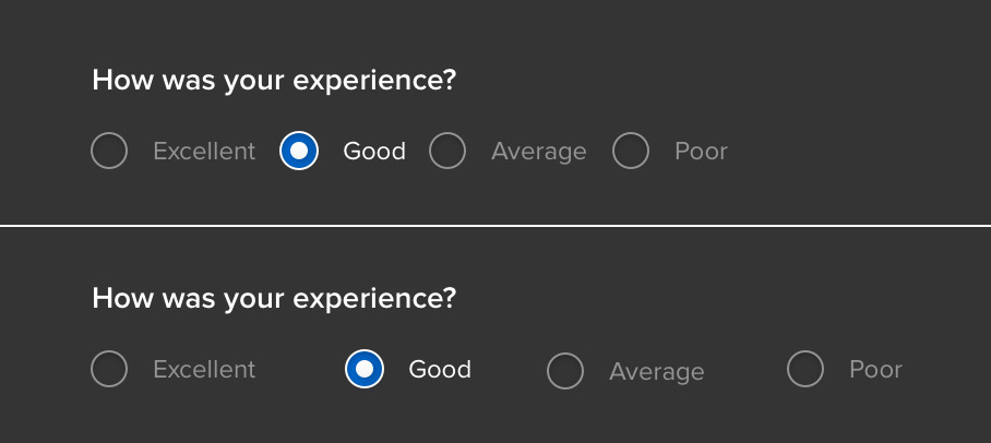 레디오 버튼의 항목 옵션 목록을 세로로 표시하는 것이 좋지만 가로로 정렬하고 싶다면 목록 항목 간의 여백에 세심한 주의를 기울여야 한다. 자칫 가로로 정렬된 옵션을 사용자가 선택할 시 구분하기 어려울 수 있기 때문이다.