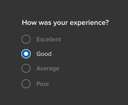 라디오 버튼은 사용자가 항목 목록에서 하나의 옵션만 선택할 수 있을 때 사용해야 한다. 버튼은 원형이 어야 하며 선택 시 채워져야 한다. 라디오 버튼의 모양은 체크박스와 구별되게 디자인하는 것이 중요하다.