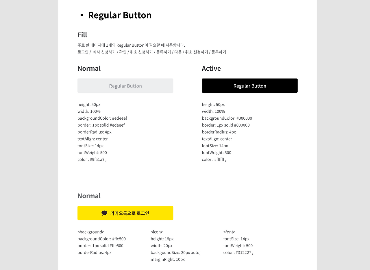 Regular button의 경우 height: 50px, width:100%(모바일 기준, 양 옆 간격(양옆 margin)을 제외하고 버튼의 너비가 100%)를 주로 사용한다. 버튼의 유형이 반복되다 보니 이런 경우 코드로 정리하여 프론트 개발자가 복사하여 바로 사용할 수 있도록 밑 작업을 해놓는다.