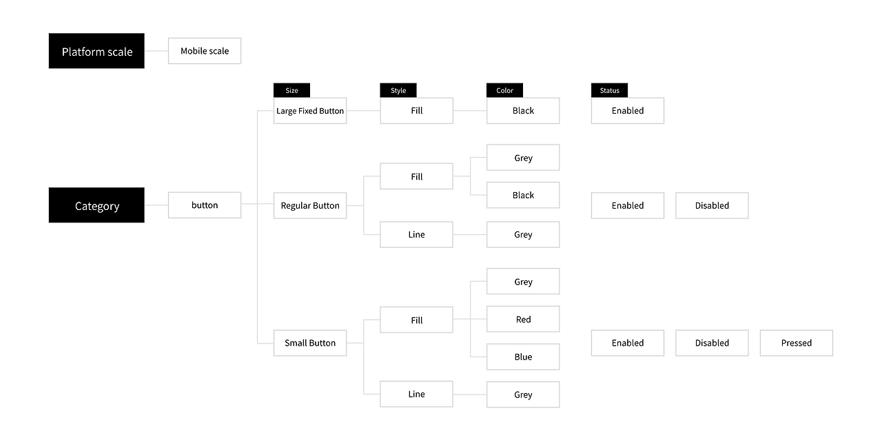 button은 Large, Regular, Small 세 가지 사이즈로 구분하였으며, Style(Fill, Line)과, Color, Statue(Enabled, Disabled, Pressed)로 세분화하였다.