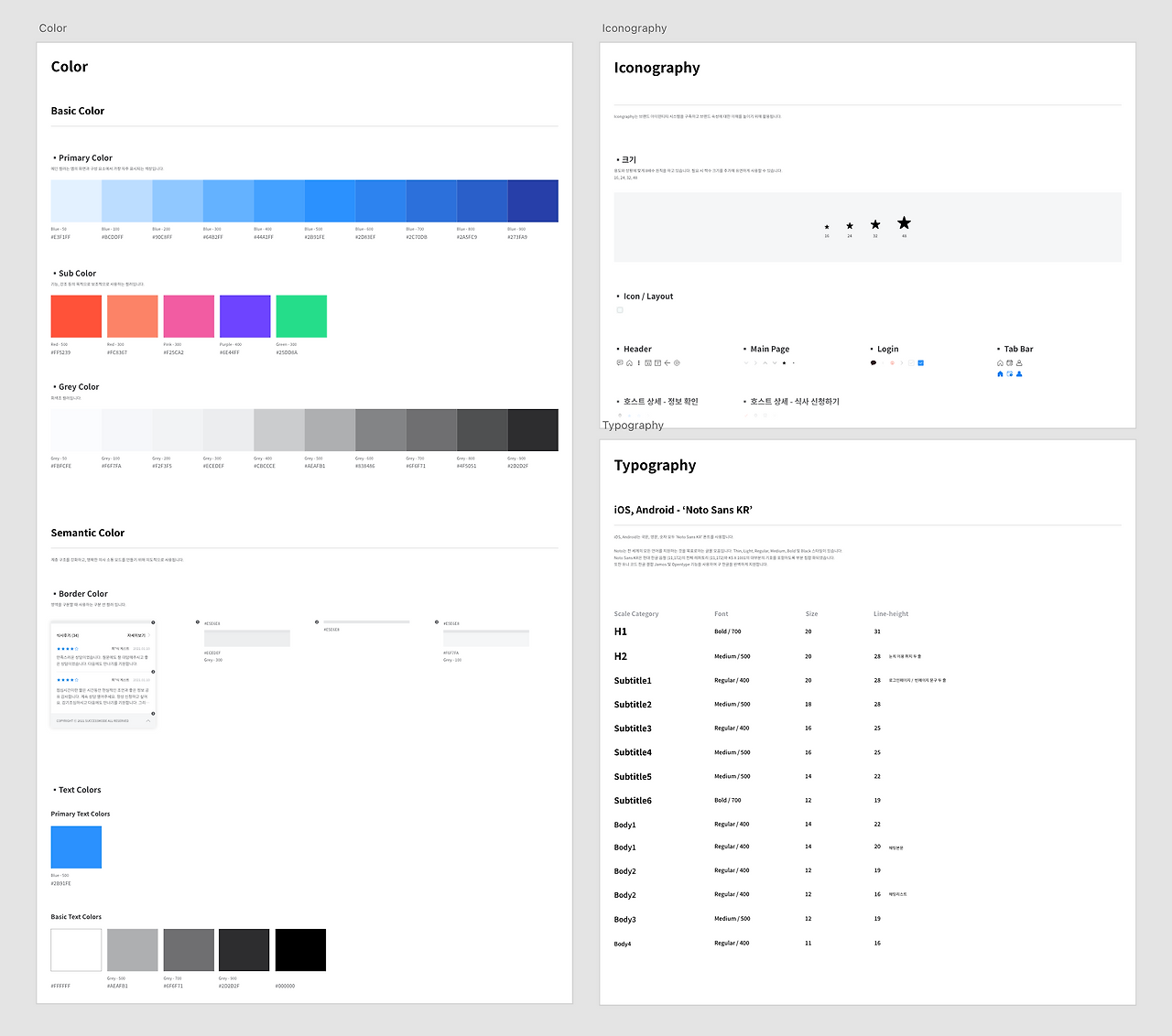 스크롤 끝 간격, 양 옆 간격 이외에도 Data tables, Tab bar 등 디자인 컴포넌트를 어떤 방식으로 디자인하였는지 개발자와 공유하기 위해 정리해두었다. 디자이너 입장에서도 어떤 원리, 의도로 디자인하였는지 설명할 수 있어야 했기 때문에 일관성에 민감하게 대처하였다.