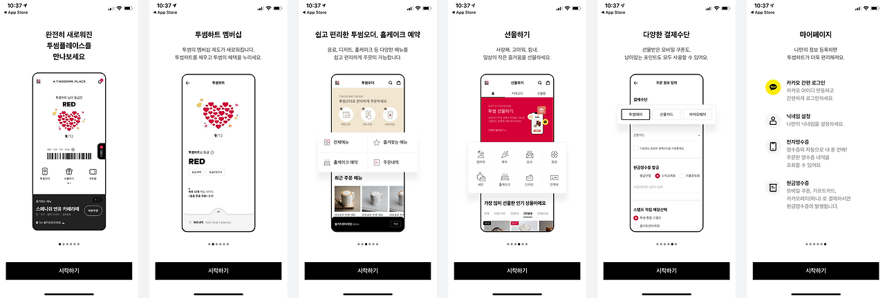 앱을 설치한 사용자에게 투썸의 핵심 기능(투썸하트, 투썸오더, 선물하기, 결제)에 대해 안내해준다. 총 6페이지로 이뤄져 있으며, 시작하기를 클릭하여 스킵도 가능하다.