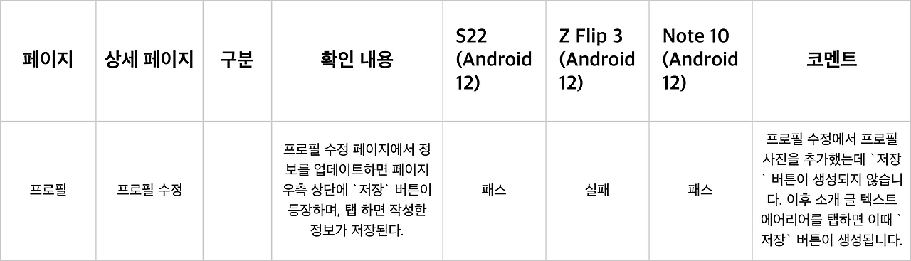 이번 QA는 개발이 완료된 상태에서 팀 전체가 참여했으며, 테스트 기간은 대략 3주를(실제로는 한 달 정도 걸린 것 같다.) 잡고 크런치 모드일 때 진행되었다. 프로덕트 전체를 테스트 범위로 잡고 QA 시트에 대략 600여 개의 확인 내용이 작성되었으며, Android(S22, Z Flip 3, Note 10), iOS(SE2, 11, 13, 13 pro, 14 pro)를 배분받아 테스트 계정에서 QA를 시작하였다.