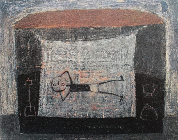 장욱진, <모기장>, 1956 그림 <모기장>의 인물은 팔깍지를 하고 방안에 드러누워 한껏 게으름을 피우는 모습이다. 빈둥빈둥 거리는 폼이 참으로 팔자가 좋다. "나물밥 먹고 나서 물 마시고 팔을 베고 누워도 즐거움이 그 가운데 있다"는 공자의 말이 구현되면 딱 이 그림과 같지 않을까.1