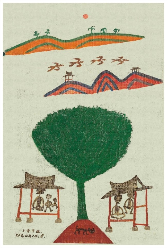 장욱진, <풍경>, 1978 또한 여기에는 오랜 전통의 관심과 향토적 분위기가 서려 있다. 그의 그림에 자주 보이는 산을 중심으로 해와 달이 대칭으로 떠 있는 모습은 왕과 왕비를 상징하는 조선시대 산수화 병풍과 유사하다. 이러한 도식을 두고 미술사학자들은 해와 달, 천상과 지상, 음과 양처럼 도가적 사상에 근원을 둔 화가의 동양적 우주관을 나타낸 것이라는 해석을 내놓기도 한다.