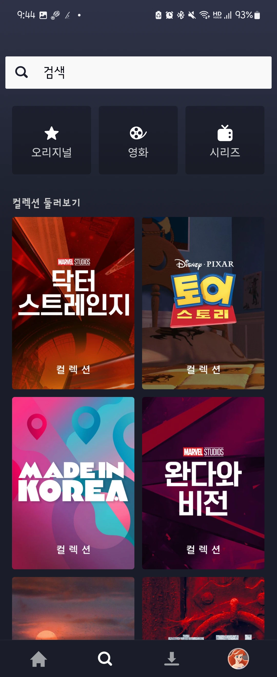 검색 탭에 진입하면 '오리지널, 영화, 시리즈' 테마 버튼으로 큰 카테고리가 나눠져 있고 '컬렉션 둘러보기'로 구성되어 있다. 이 화면에서 의아했던 부분은 '오리지널, 영화, 시리즈' 탭 진입 시 우측 상단에 크롬캐스트 공유 기능이 존재하는데 검색 화면 진입 시에는 왜 해당 버튼이 없는지 의아해졌다. 홈 진입했을 때도 해당 버튼이 존재하는데, 동일한 위치에서 동일한 사용성을 제공하는 것이 좋지 않았을까 하는 아쉬움이 든다.