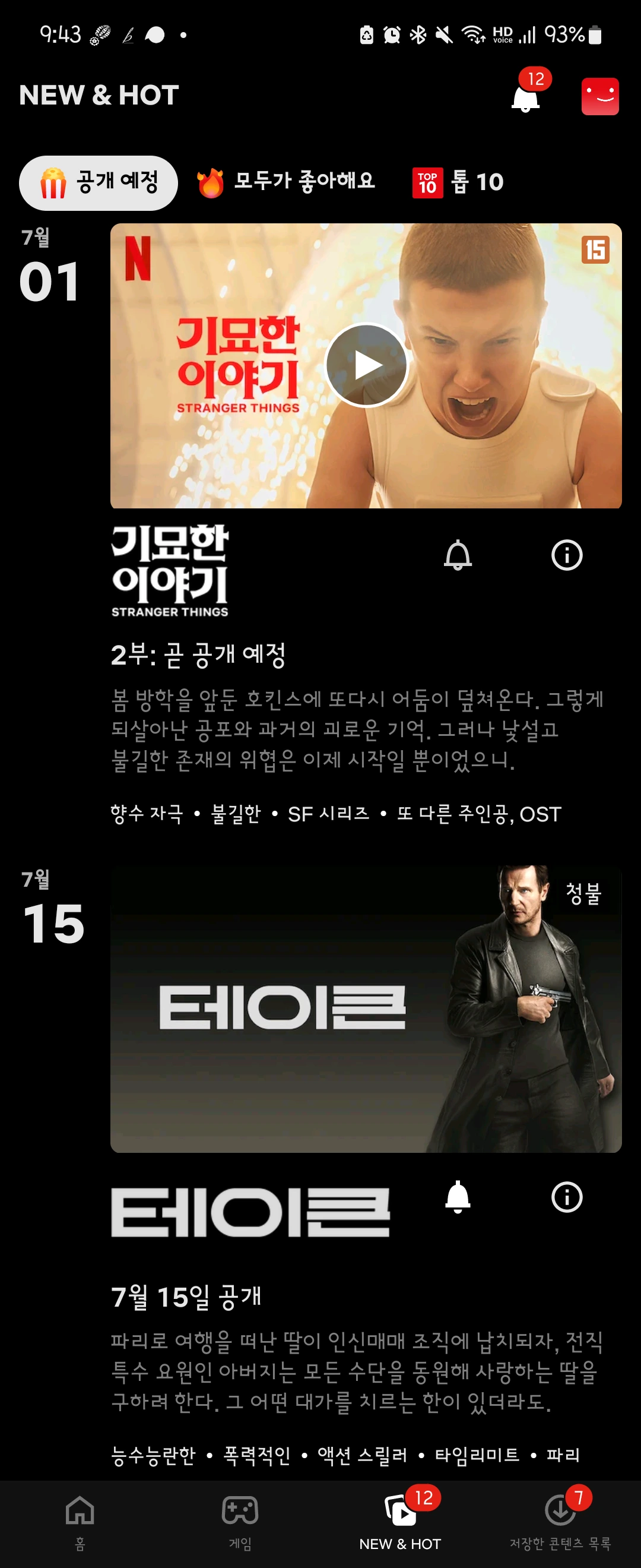 하단 NEW&HOT 탭 들어가면 공개 예정인 프로그램들의 목록이 나열되는데, 단순히 제목과 썸네일, 프로그램 소개만 있는 것이 아니라 바로 알림을 설정할 수 있는 버튼을 만들어줘서 사용자가 보고 싶은 프로그램은 개봉일에 해당 알림이 올 수 있도록 설정할 수 있는 기능이 좋았다.