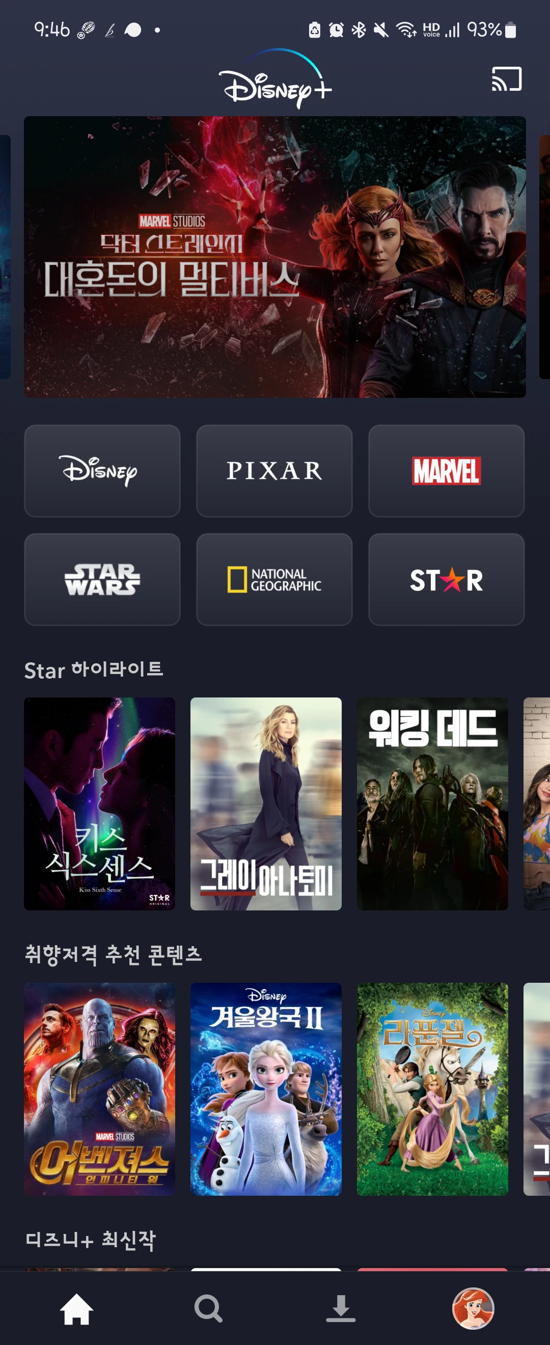 홈 상단에 디즈니, 픽사, 마블, 스타워즈, 내셔널지오그래피, 스타 카테고리가 나누어져 있는 게 좋은 것 같지만, 사람들이 해당 카테고리에 어떤 것들이 존재하는지 아는지 궁금해졌다. 나의 경우 마블이랑 내셔널지오그래피, 디즈니는 알겠으나, 다른 카테고리엔 어떤 것들이 있는지 잘 떠오르지 않아서 해당 카테고리에 어떤 내용들이 있는지 힌트를 줄 수 있는 방법이 없을지 고민해보게 되었다. 디즈니 어플에도 추후에 이런 기능이 나온다면 좋을 것 같다.