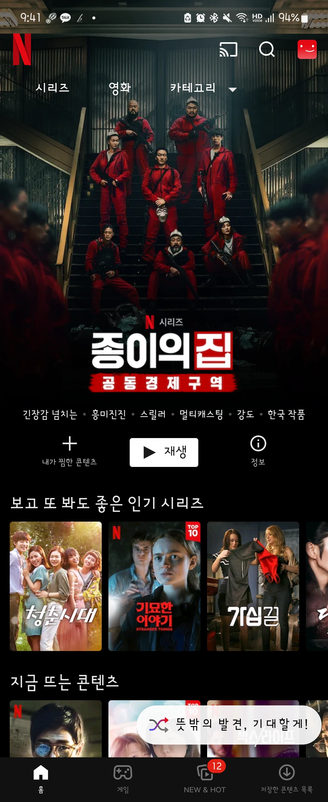또 넷플릭스 상단에는 메인 배너로 추천하는 프로그램이 나오는데 바로 재생 버튼과 찜하기 버튼이 존재하는 게 인상 깊었다. 바로 볼 수 있도록 유도하는 좋은 UX라는 생각이 들었다.