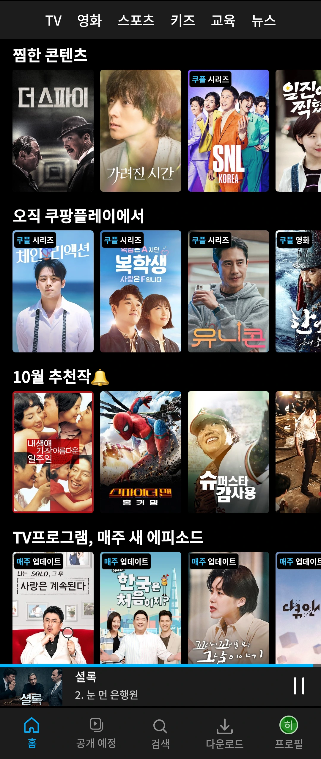 영화가 보고 싶은 날이 있다. 카테고리로 접근하지 않으면 시리즈물이 많은 OTT의 경우 영화를 고르기가 너무 힘들다.(특히 넷플릭스, 디즈니 플러스) 상단에 TV/영화/스포츠/키즈 등으로 분류가 되어있으니 시청하고 싶은 카테고리로 바로 접근할 수 있어서 좋은 것 같다.
