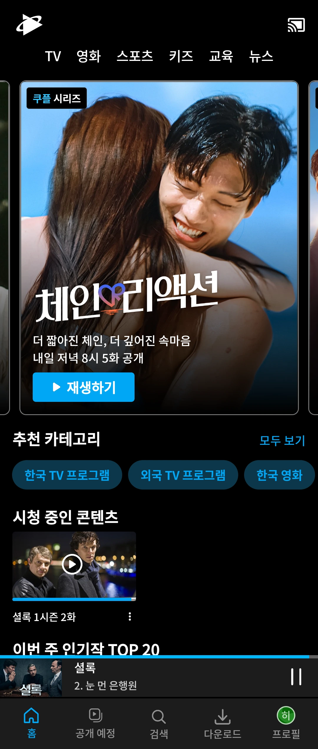 상단 메인 배너 아래 세분화된 추천 카테고리도 유용해 보인다. 그리고 바로 '시청 중인 콘텐츠'가 나와서 좋다. 그다음 '이번 주 인기작 TOP 20'가 나오는 구성도 좋은 듯하다.