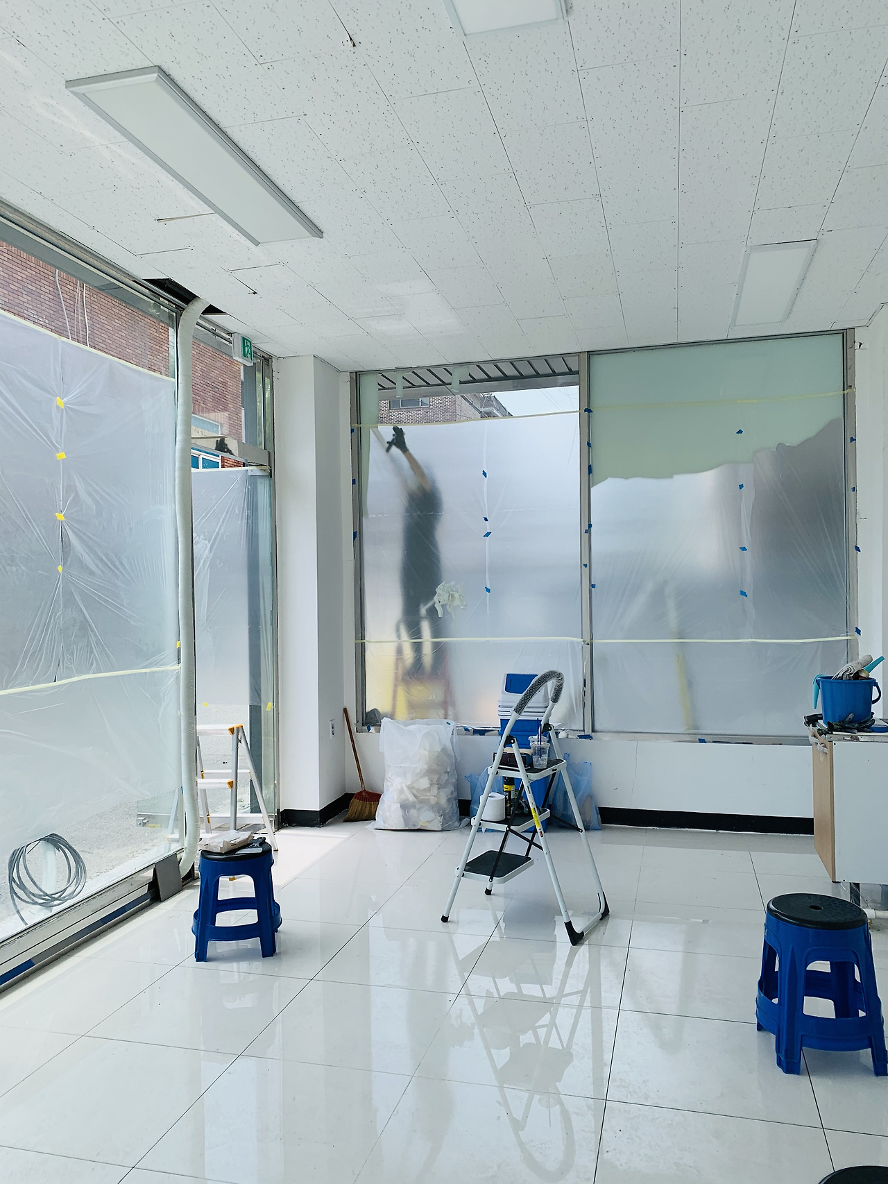 본격적인 공사에 들어가기 전 빈 매장에 남아있는 이전의 흔적들을 지우기 시작했다. 천장 조명을 제외하고 매장은 완전히 텅텅 빈 상태였지만 이전에 편의점에서 사용했던 외부 유리 시트지를 먼저 제거해야 했다.
