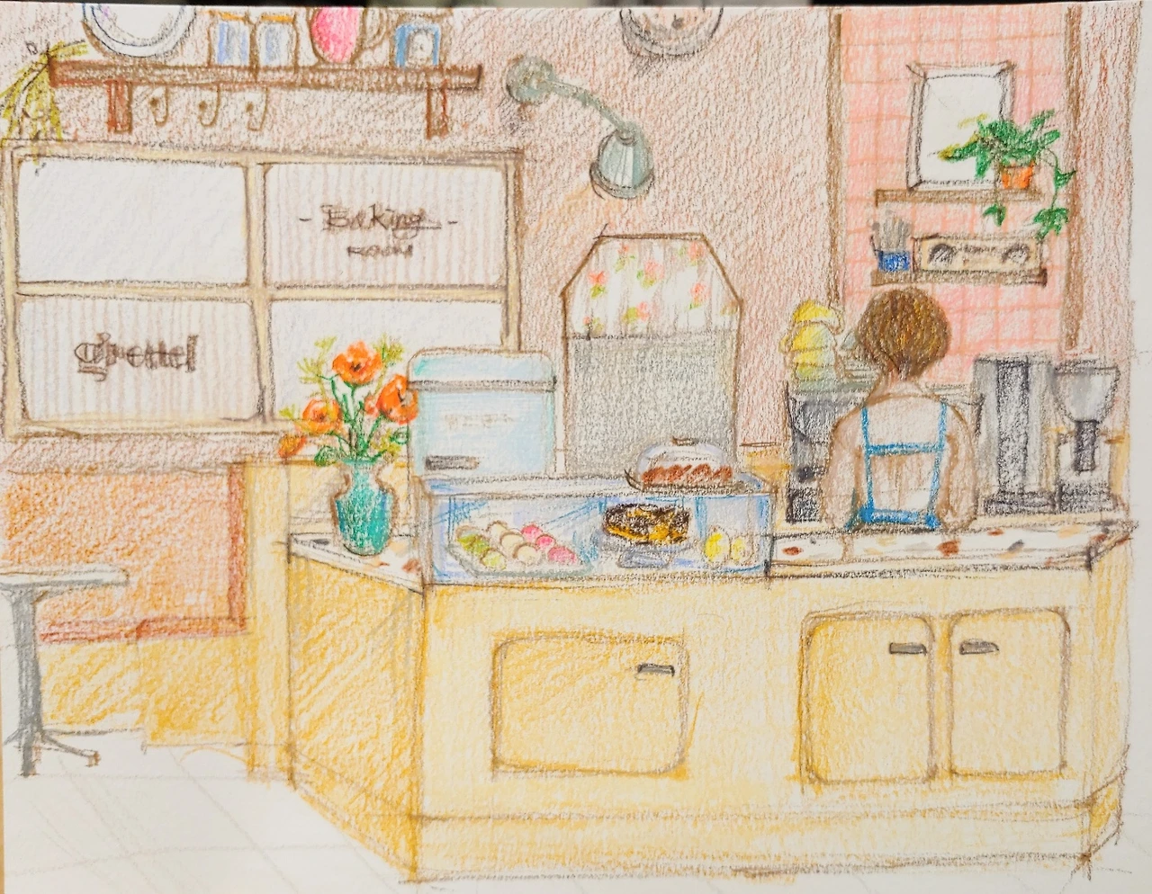 사실 아무리 도면을 들여다보고 컨셉 회의를 한다고 해도 정확한 우리의 카페가 머릿속에 딱 그려지지는 않았다. S는 우리가 머릿속으로만 그리는 데에 한계점이 온 것을 알았는지 손으로 그린 스케치 사진을 보내줬다. 모눈종이에 연필로 그린 도면이 우리의 최초였다면 이 스케치는 우리가 앞으로 가야 할 방향을 알려주었다. S의 입면도 작업이 늦어지는 바람에 갈피도 못 잡은 우리에게 이 스케치 한 장은 한줄기 빛과 같았다.
