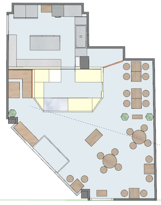 테이블 배치는 S가 대략적으로 그렸다. 테이블을 많이 배치하면 그만큼 수용 가능한 고객 수가 많아지고 매출과 직결되는데 아무래도 시기가 시기인만큼 간격을 넓게 두고 싶었다. 그래서 위 도면에서 두 테이블을 빼고 간격을 넓혔다.