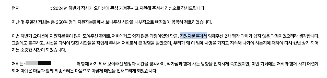 발매된 곡의 가사와 내 가사를 비교하고 필사도 해봤지만, 이 영역은 사실 '정확한 답'이라는 게 없지 않은가. 이번 곡을 공부한다고 다음 곡에 적용할 수 있는 것도 아니고, 무작정 엉덩이 붙이고 열심히 한다고 해서 성과가 나는 것도 아니다. 작년에 별도로 작사가 오디션에 참여한 적이 있었다. 2차 불합격이라는 통보 이메일을 받고 간절한 마음을 담아 제출한 시안에 대해 간단한 피드백을 받을 수 있을지 물었으나, 따로 답변은 오지 않았다. 350명의 시안을 일일이 검토하고 피드백을 줄 시간도, 여력도 없을 것이란 건 잘 알지만 어쩔 수 없이 취준 때 겪은 무력감이 또다시 들었다. 심지어 기업은 면접 불합격이면 거마비라도 주지만, 작사는 채택이 되지 않으면 작업한 시간과 노동력에 대한 아무런 보상도 받지 못한다.