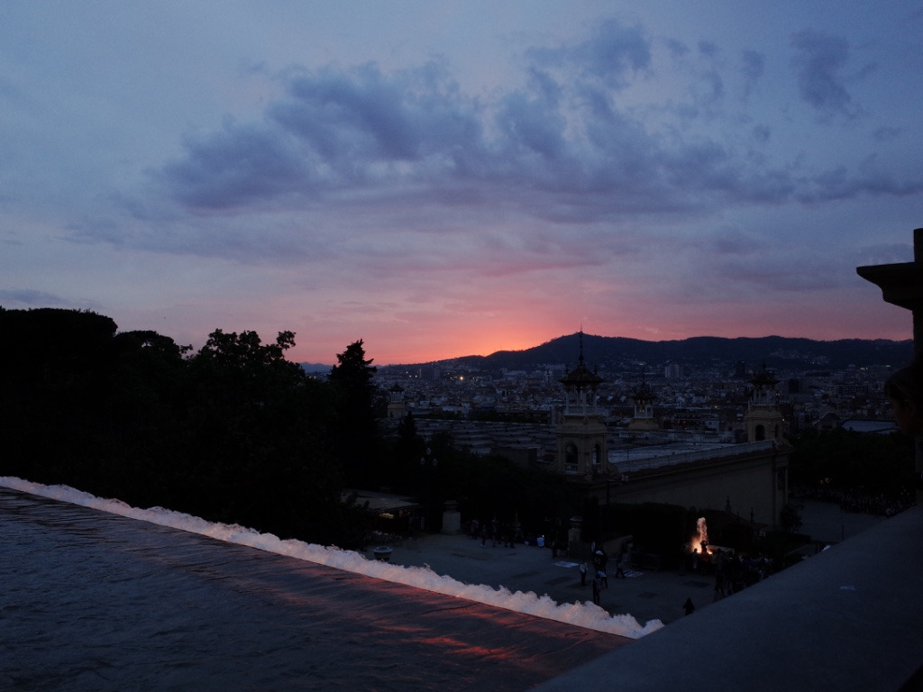 아홉 시가 되어 노을이 보이기 시작하면 분수가 보글보글 나오기 시작한다. 사람들이 위에 모여있길래 우리도 제일 높은 곳에서 보자 하고 올라갔는데 가까이서 보는 게 제일이었다. 미술관 쪽에서는 잘 안 보여서 늦기 전에 뛰어 내려가기로!