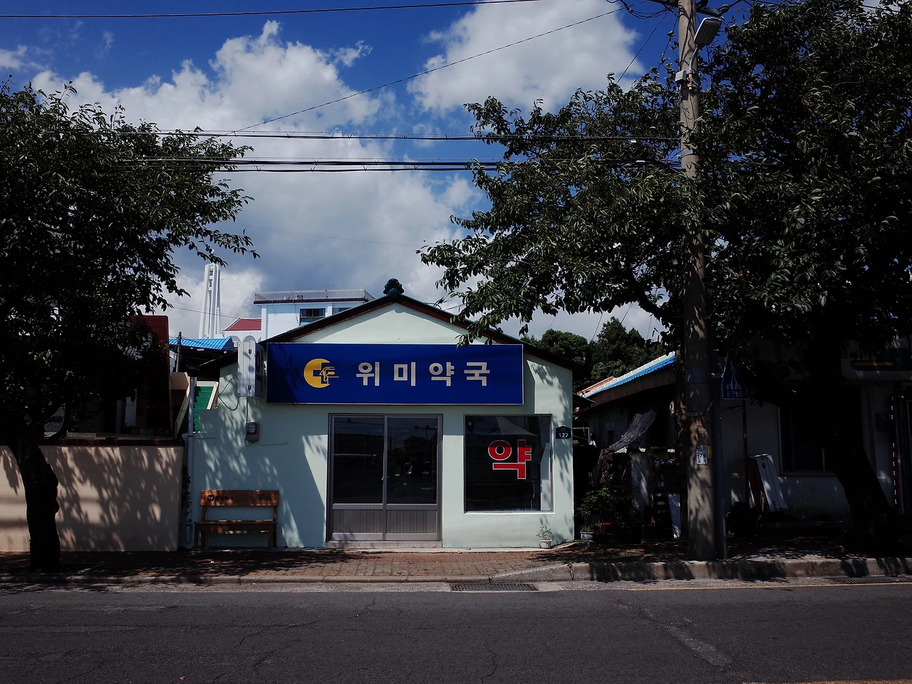 산길을 따라 혹은 해안을 따라 걷는 코스는 아니었고, 동네길을 둘러가는 소박한 코스였다. 잠깐 내리던 비는 그치고 다시 맑은 하늘 :) 오래된 건물 1층에 덩그러니 깜찍한 느낌을 주는 라바북스와 시스베이글.