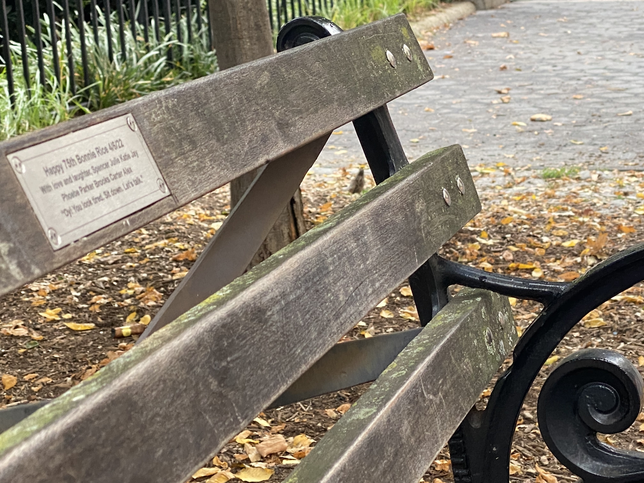 - 기부자나 헌정 대상자를 기리기 위해 벤치에 명패를 부착하였음.